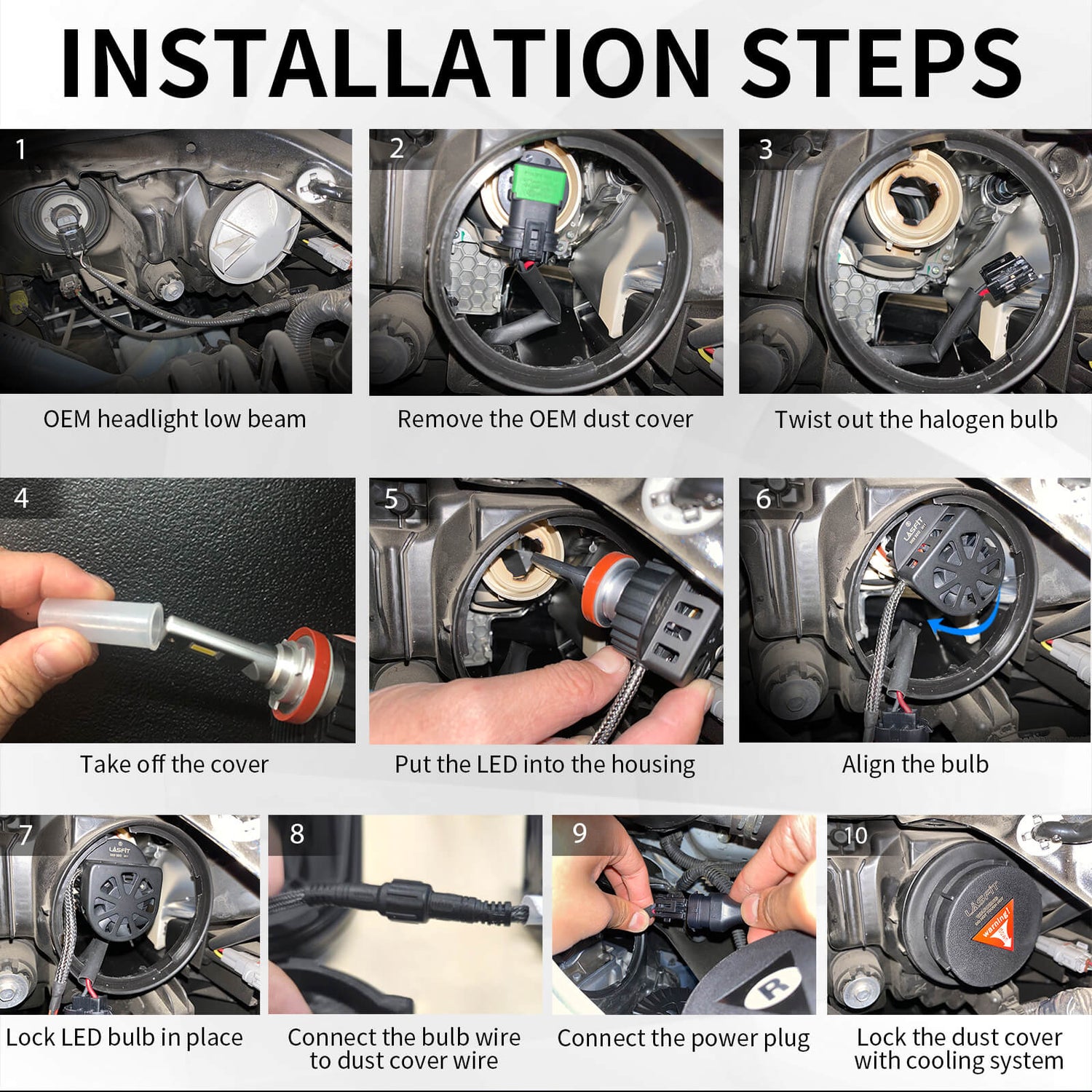 - Lasfit LED headlight bulb replacements are available for Grand Cherokee models equipped with factory halogen headlights or factory HID headlights.