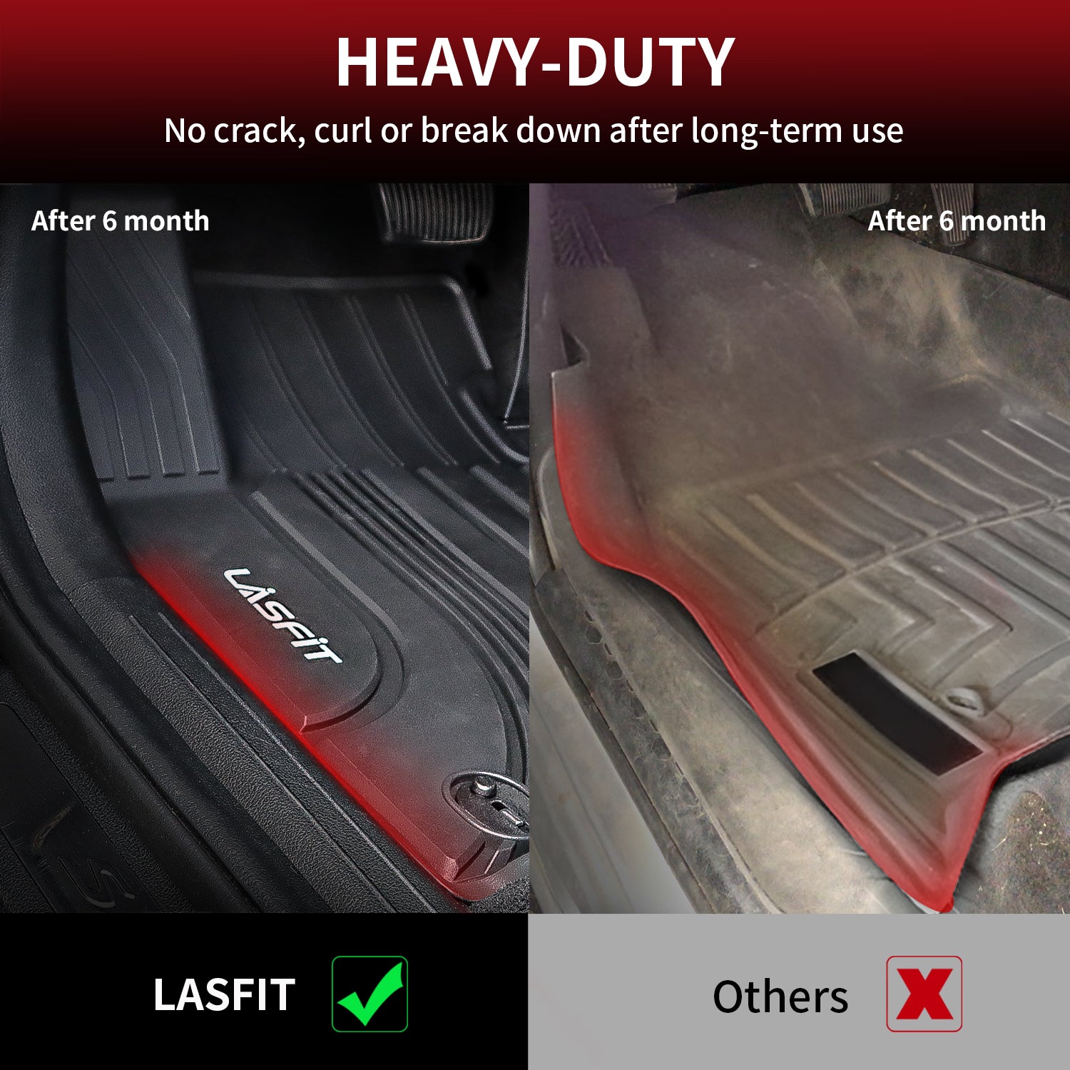 - WeatherTech: Made from high-density polyethylene, WeatherTech mats are rigid and sturdy, offering robust protection. However, they are less flexible than Lasfit mats, which are designed for a more pliable feel while maintaining durability.
