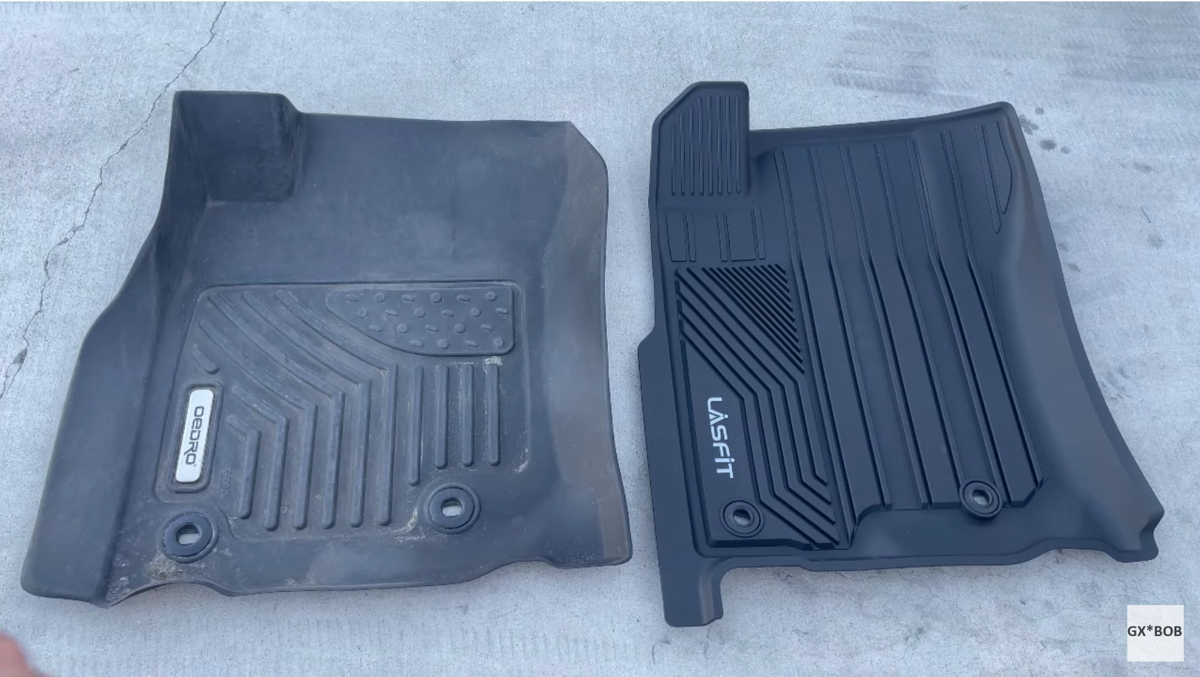 Compare to my last floor mats, there are three features, first of all,Lasfit ridges are so much higher, another visual difference is the bottom extends out while my last floor mats don’t. The last difference is the kick has ridges and is higher. And the ridges go all the way to the front, all the way to your gas pedal this one lacks.