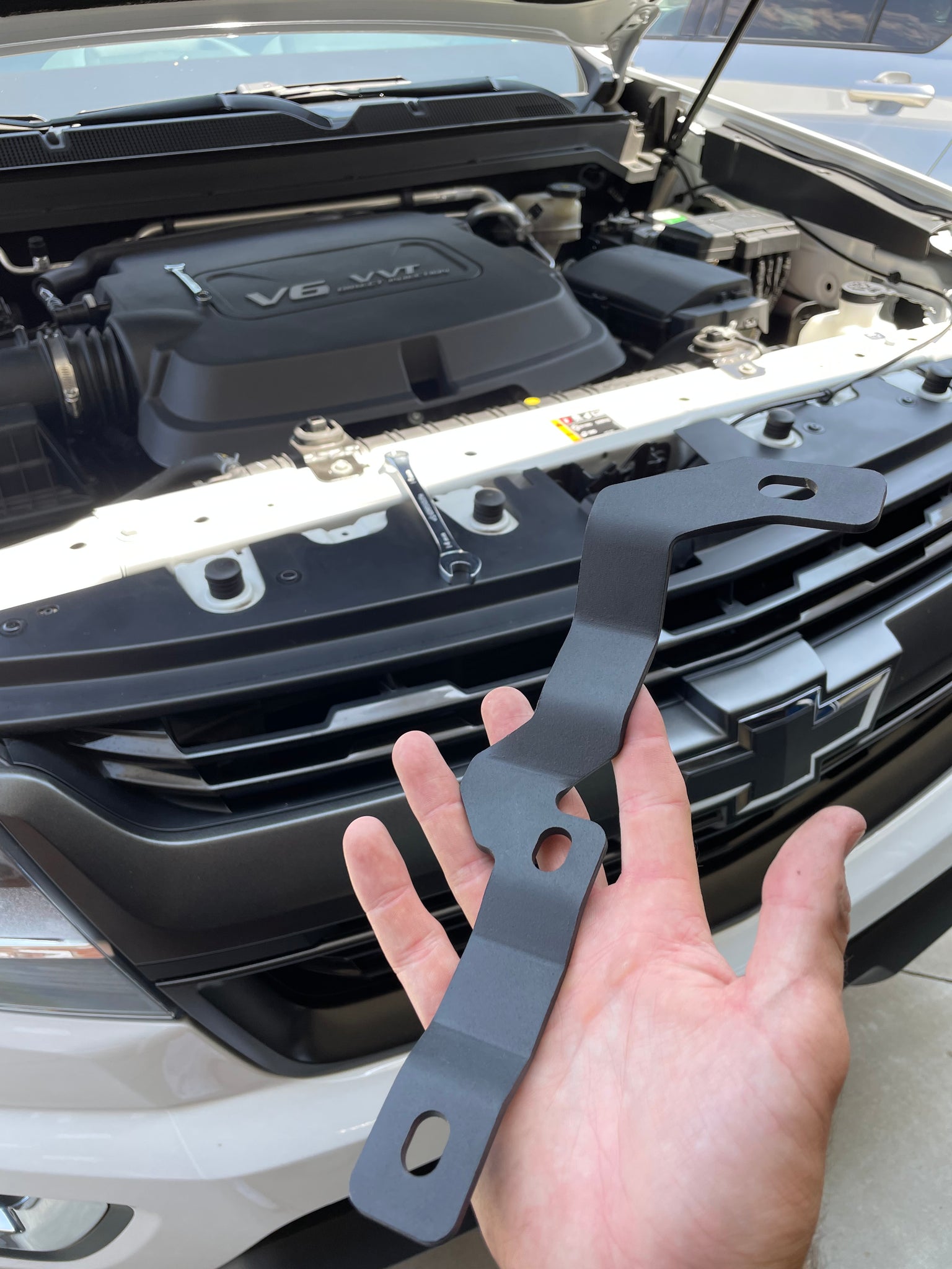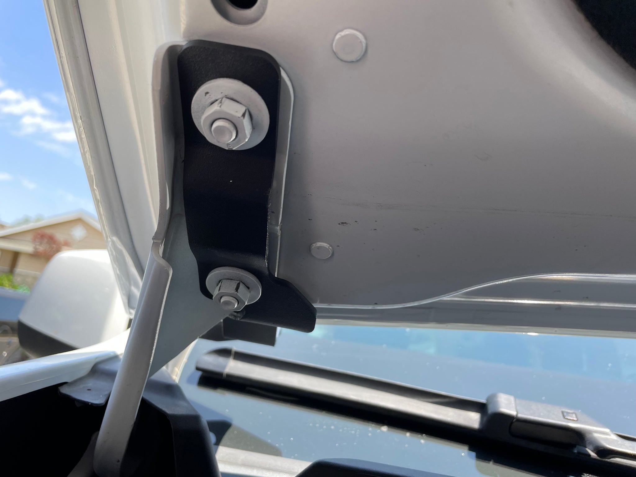 After you finish assembling the lights to the mounting brackets you’ll want to mount the brackets to the hood. You’ll need to take off the hood hinge bolts using your 12mm socket and wrench. Make sure you put the brackets on the right side meaning the driver side or passenger side because if not installed on the right side you will run into clearance issues. Once you put the brackets under the hood you’ll install the hood hinge bolts to the original place over the brackets.
