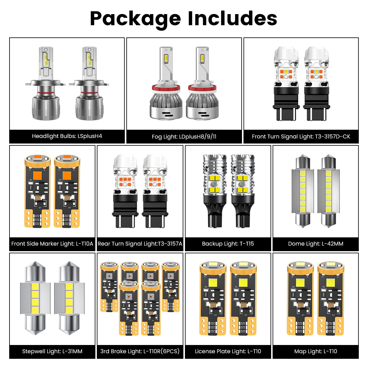 | Front Side Marker Light | 168/194 | L-T10 Series | 400LM | amber, built-in canbus design, non-polarity design |
