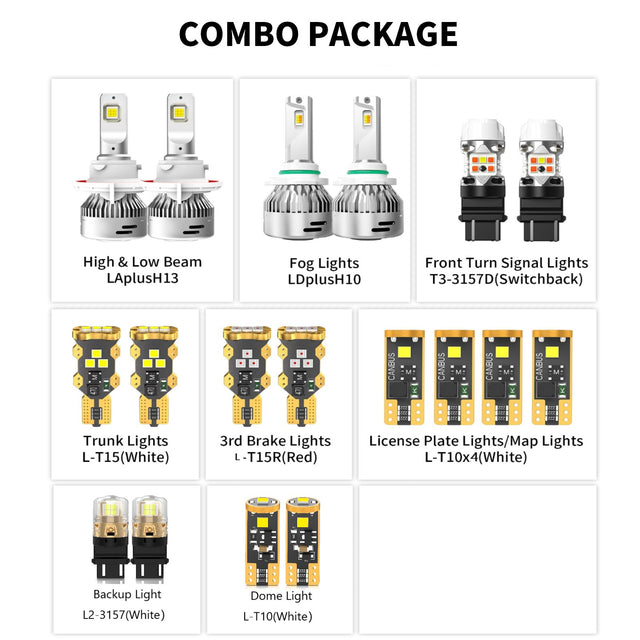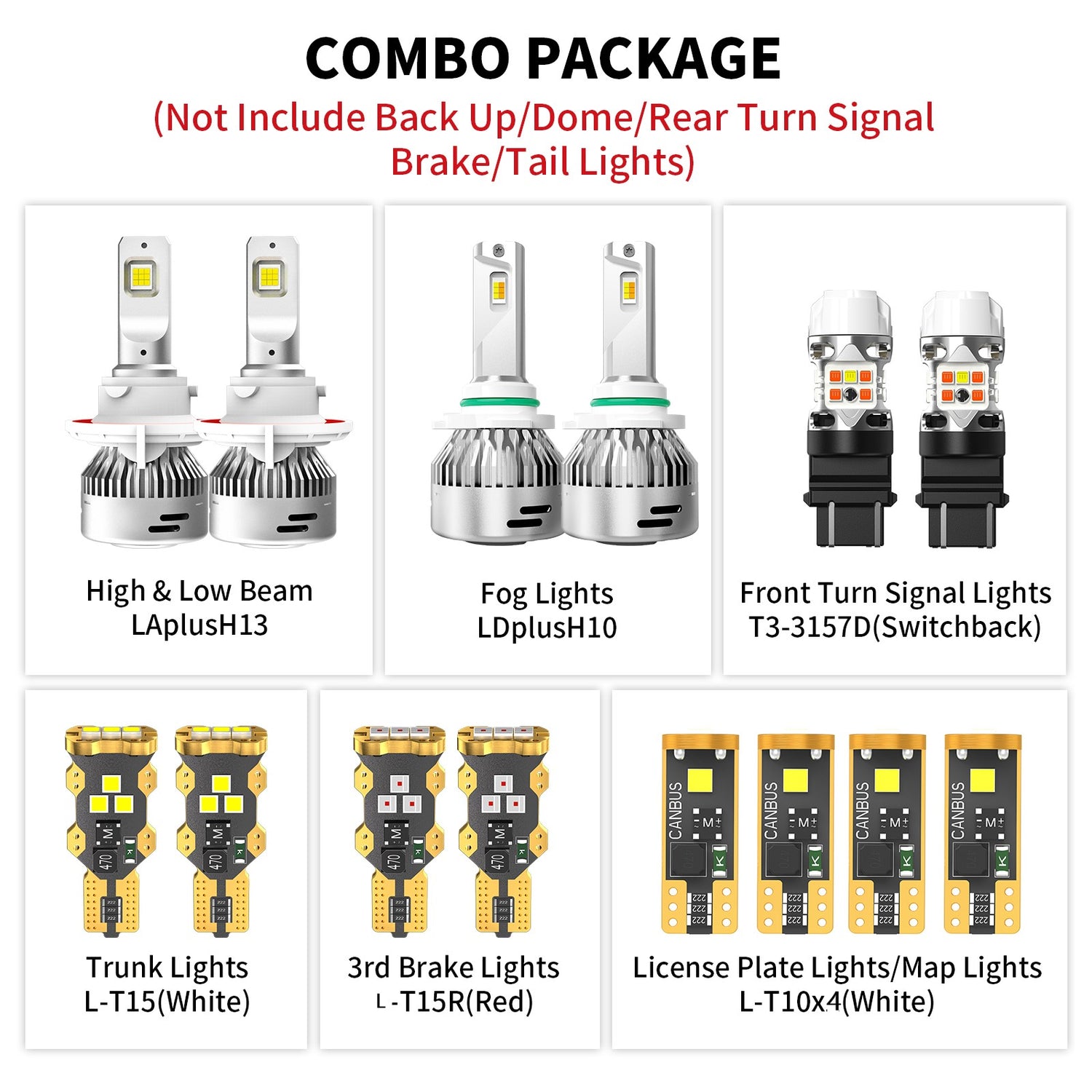 All LED lights on this page are specially fit Ford F-150 2004 2005 2006 2007 2008, including led forward lighting, fog light, front turn signal light, backup light, license plate light, trunk light, interior dome/ map light. You could choose the one you want to replace or the combo package.Note: NOT compatible if the bulb is all in one for the rear turn signal and brake lights and these bulbs can't not work properly for trucks, so this combo package doesn't including the LED bulbs for rear turn signal/tail/brake lights.