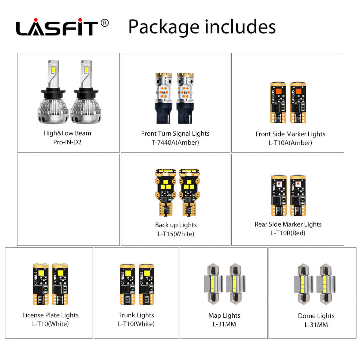 Lasfit also provides LED front turn signal lights, rear turn signal lights, front side marker lights, backup lights, brake/tail lights, trunk lights, map lights, license plate lights, and more, to support your exterior and interior LED lighting upgrades!