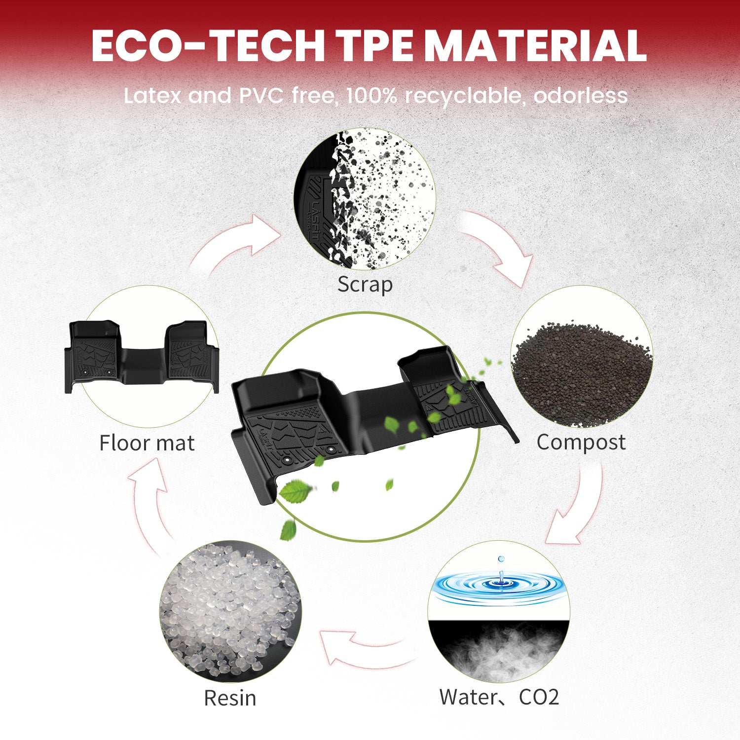 While our TPE (Thermoplastic Elastomer) floor mats are specifically designed for the Ford F-150, it's important to highlight why TPE is a superior choice over traditional rubber mats. TPE mats offer better flexibility, durability, and resistance to wear and tear. They are also more eco-friendly, as they are made from recyclable materials and are free from harmful chemicals.