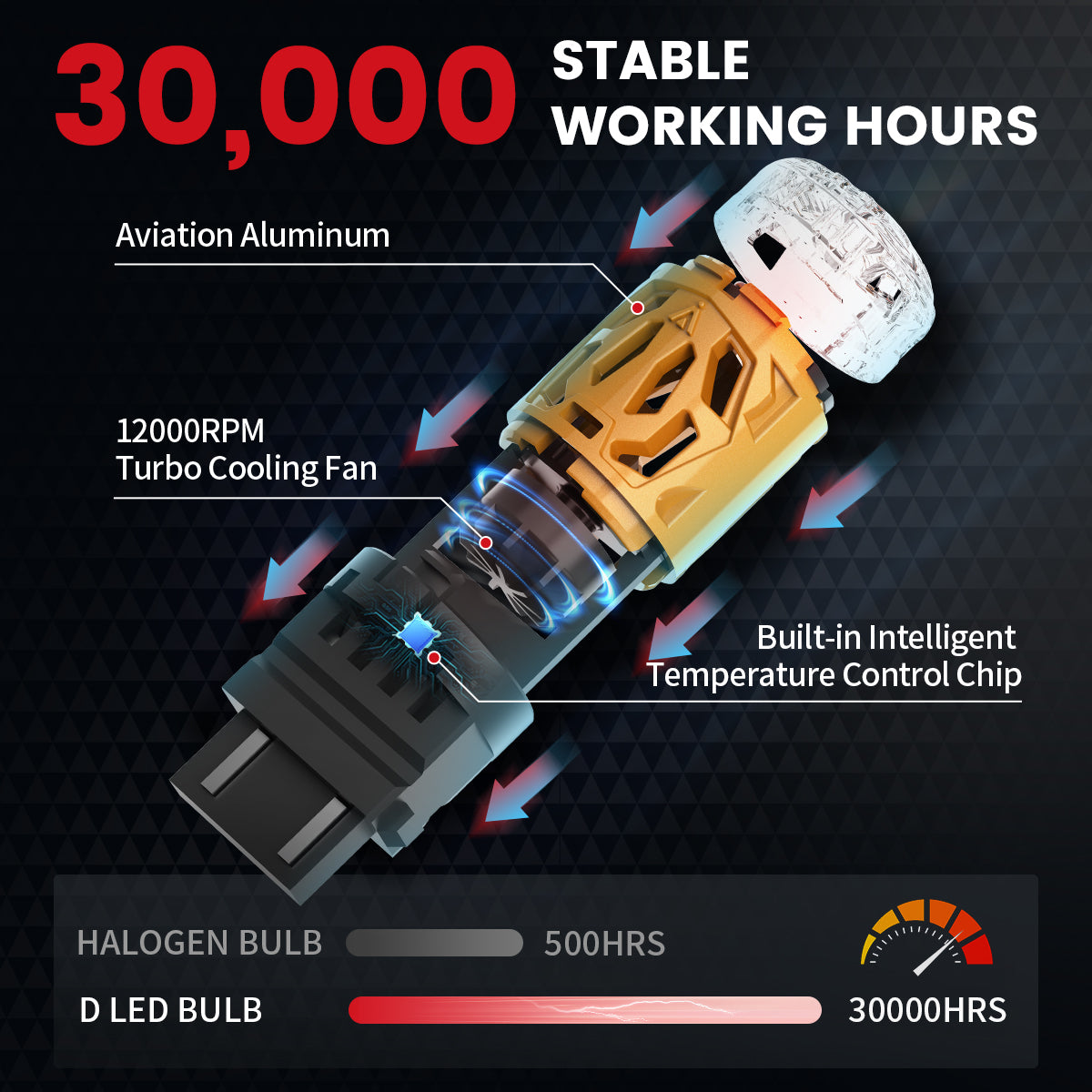 Unlike regular H4/9003 LED bulbs that don't fit the OEM dust cover, this LED bulb is integrated with a dust cover, ensuring complete protection from water, moisture, and dust.With a cooling fan extending through the dust cover, it efficiently prevents overheating, ensuring stable performance and longer lifespan.Equipped with powerful 80*80MIL LED chips, these bulbs deliver an ultra-bright 5000LM output, offering clear visibility at night. A smart upgrade over stock halogens!