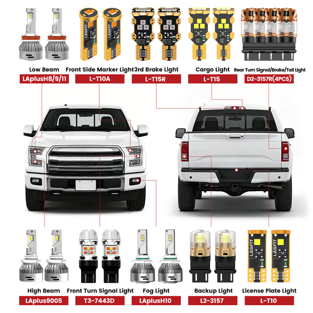 Lasfit offers bright, durable, and high-quality LED bulbs specifically designed for different trims of your Ford F-150. With quick and easy installation, you can upgrade your lighting in minutes and enjoy a brighter, safer driving experience.