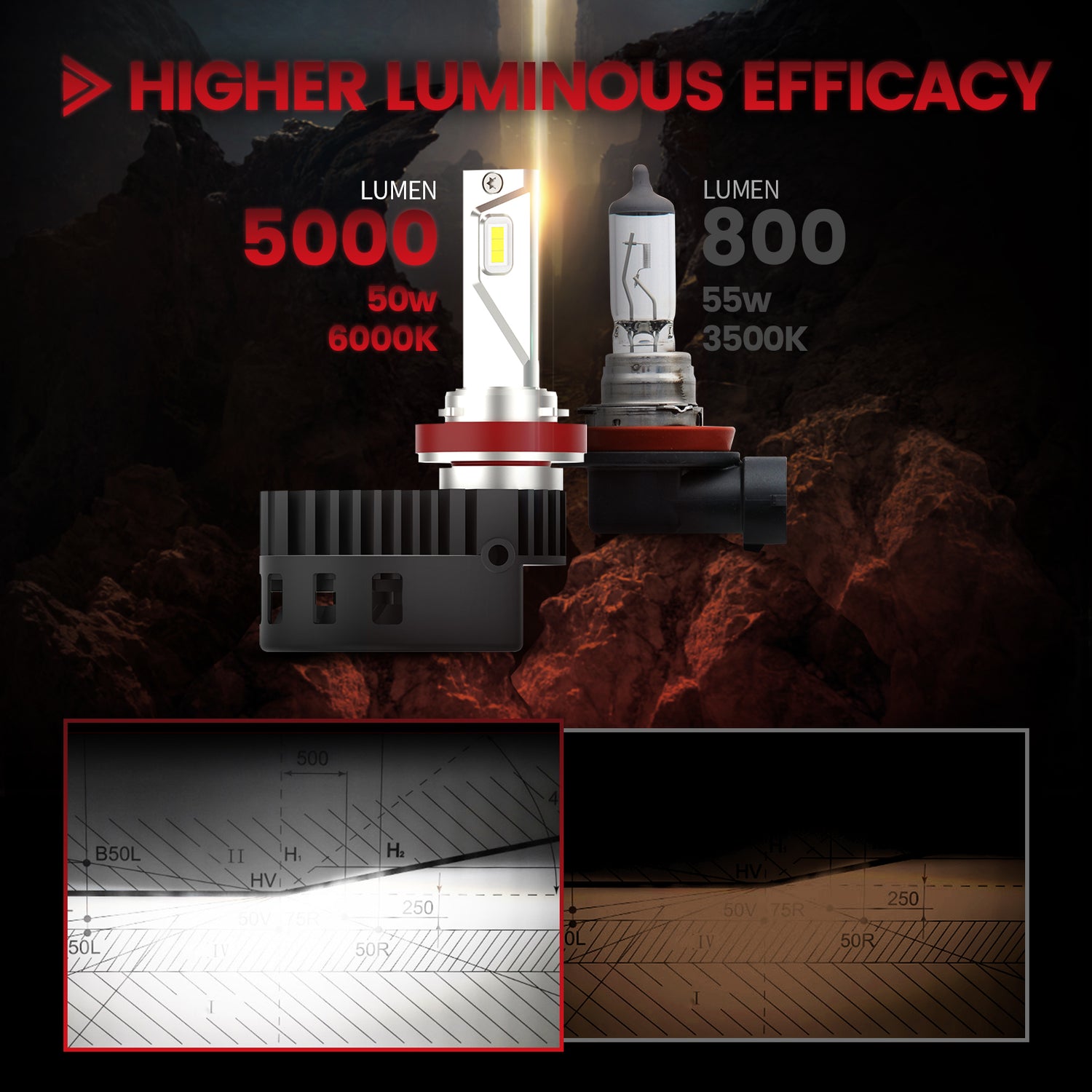 Low Beam: H11 LED Bulbs Pro-DC Series | 6000K white, 55W, 5500LM per bulb