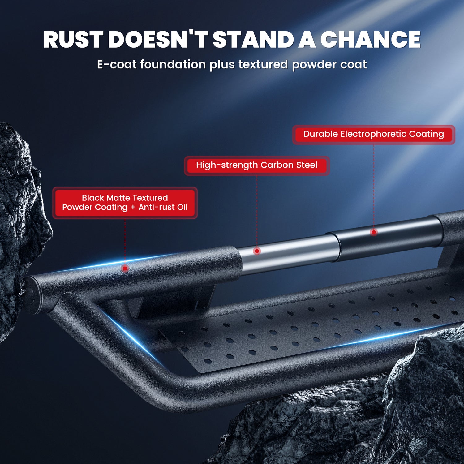 - Electrophoretic Coating: The advanced electrophoretic coating provides superior rust and corrosion resistance, ensuring the running boards maintain their appearance and function for years.