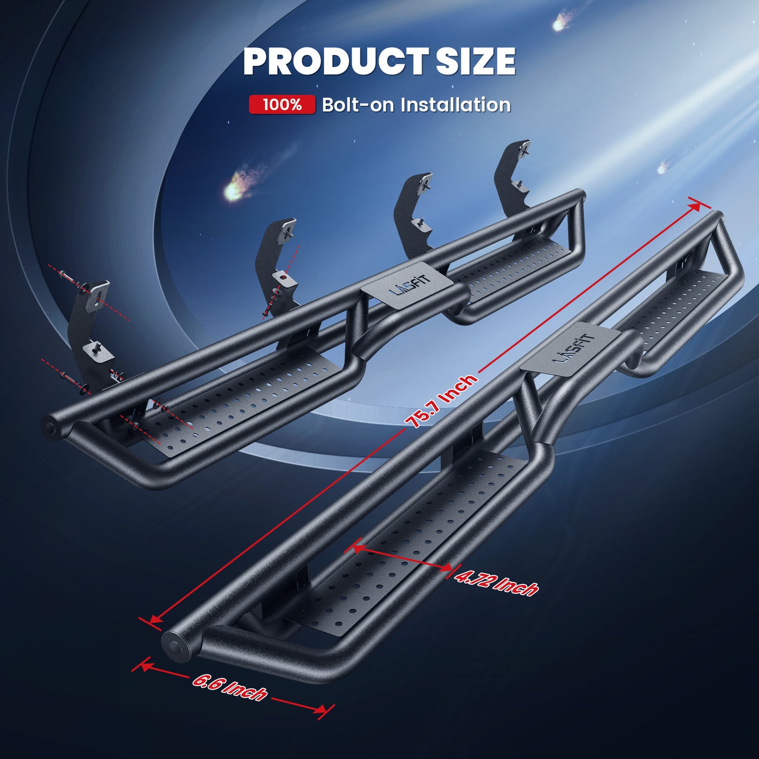 Designed to offer maximum stability, the Lasfit running boards feature three support tubes arranged in a triangular reinforcement pattern for extra strength. Additionally, a 0.55-inch steel bar connects the upper and lower tubes, allowing these running boards to support up to 600 lbs.
