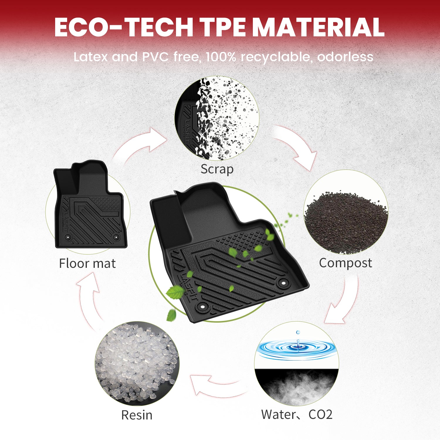 While traditional rubber mats are known for their durability, TPE represents the next generation of all-weather protection. Our TPE mats capture the ruggedness of rubber but eliminate the heaviness and strong chemical odor. They remain flexible in freezing temperatures instead of turning brittle, offer a more refined, OEM-looking finish, and are fully recyclable. It's the superior choice for the modern driver who doesn't want to compromise between superior protection, everyday comfort, and sustainable design.