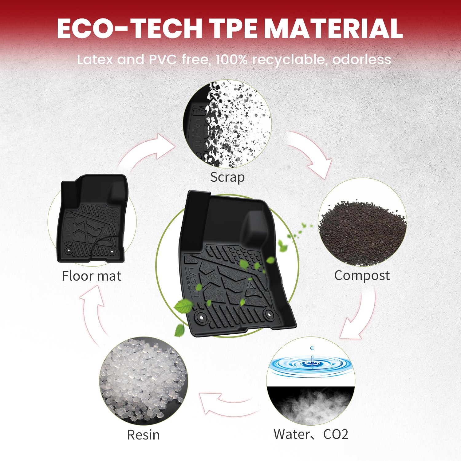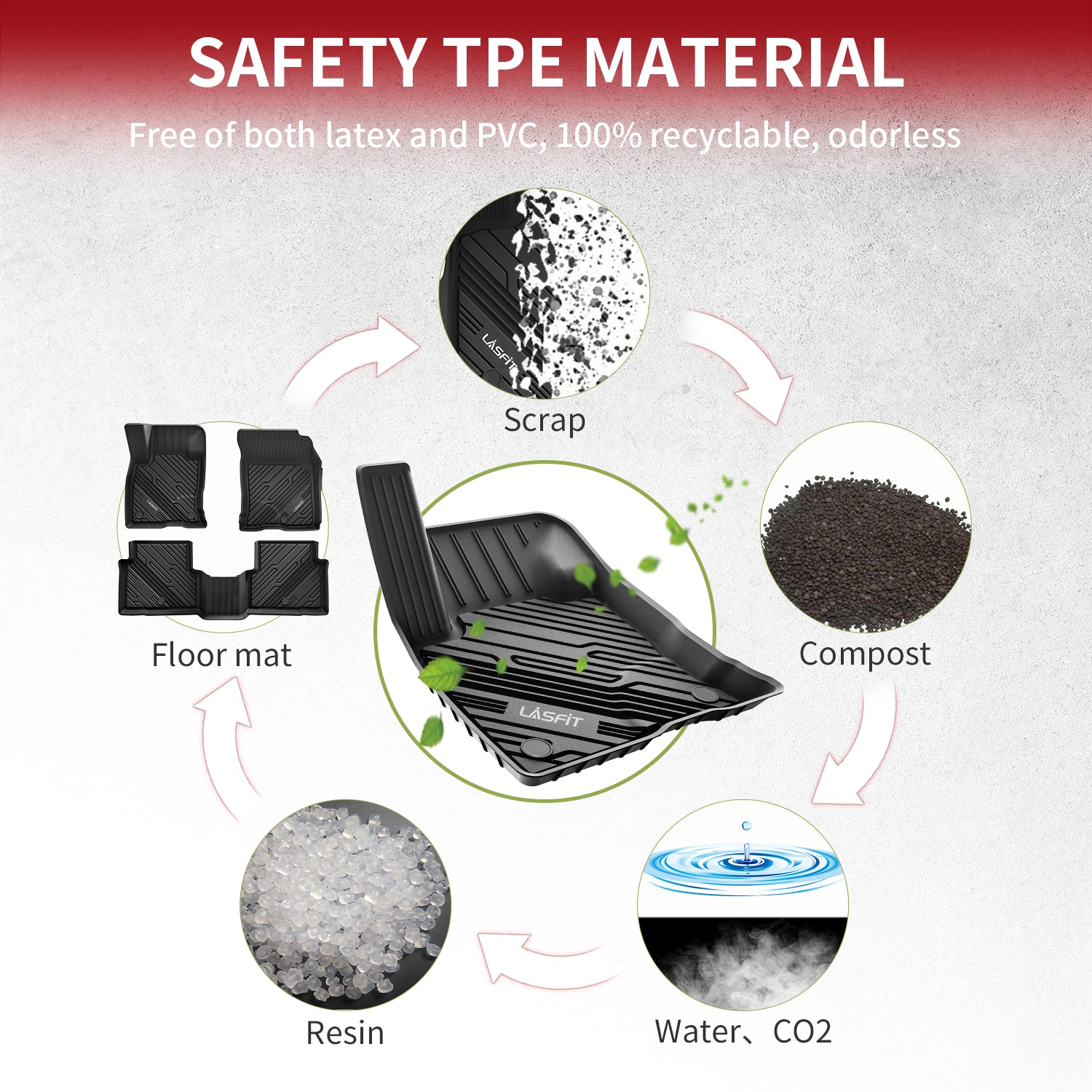 Lasfit floor liners are crafted from flexible, low-density TPE material, which offers significant advantages over traditional rubber mats. They are more durable, wear-resistant, and eco-friendly, being made from recyclable materials free of harmful chemicals. Additionally, they are incredibly easy to clean—just rinse them with water, dry, and they’re ready for your next adventure.