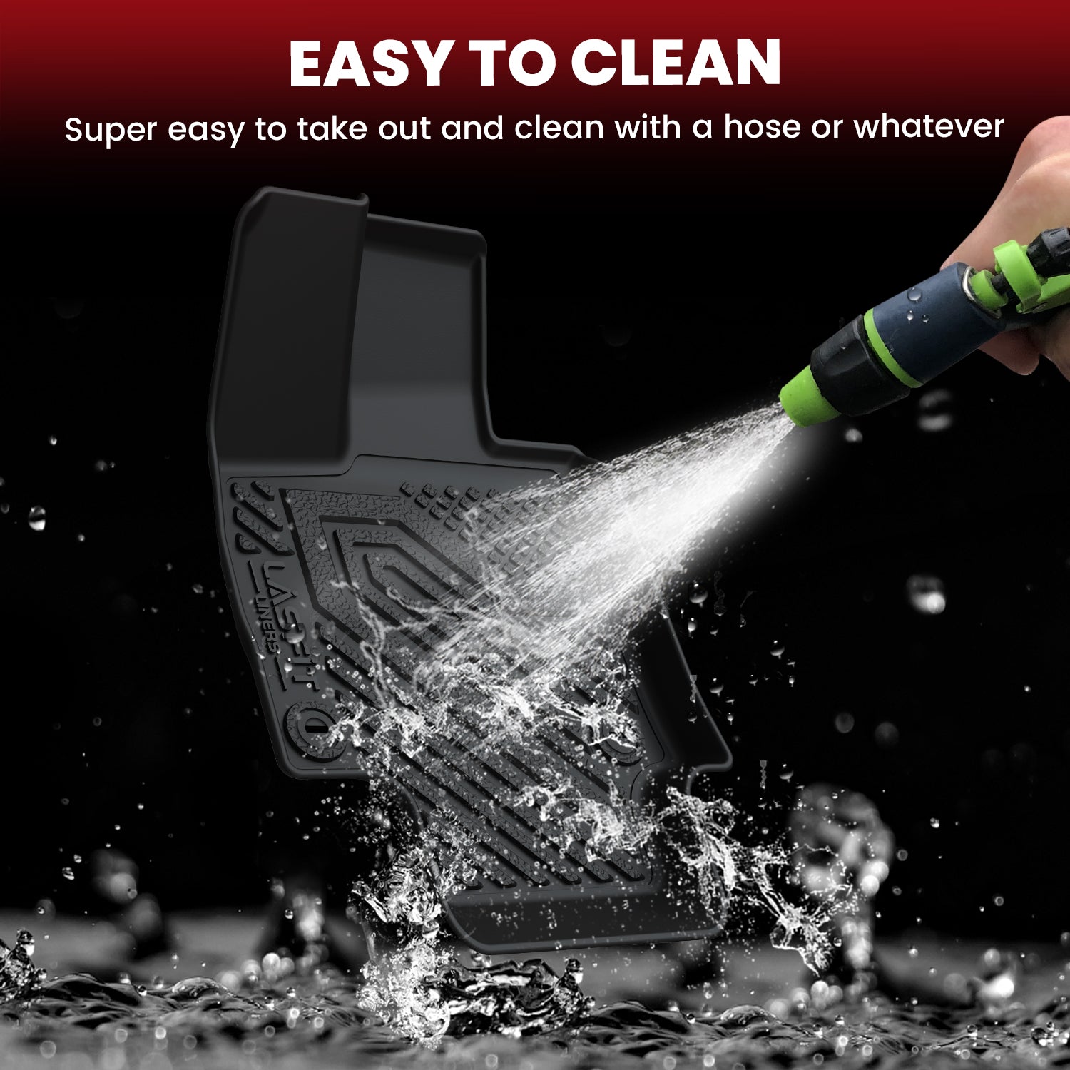 Lasfit floor liners are made from flexible, low-density TPE material, offering superior durability and flexibility compared to traditional rubber mats. TPE is more resistant to wear and tear, and unlike rubber mats, it is environmentally friendly, free from harmful chemicals, and made from recyclable materials. It’s also easier to clean—just rinse with water and wipe dry, and your mats will be ready for your next adventure.