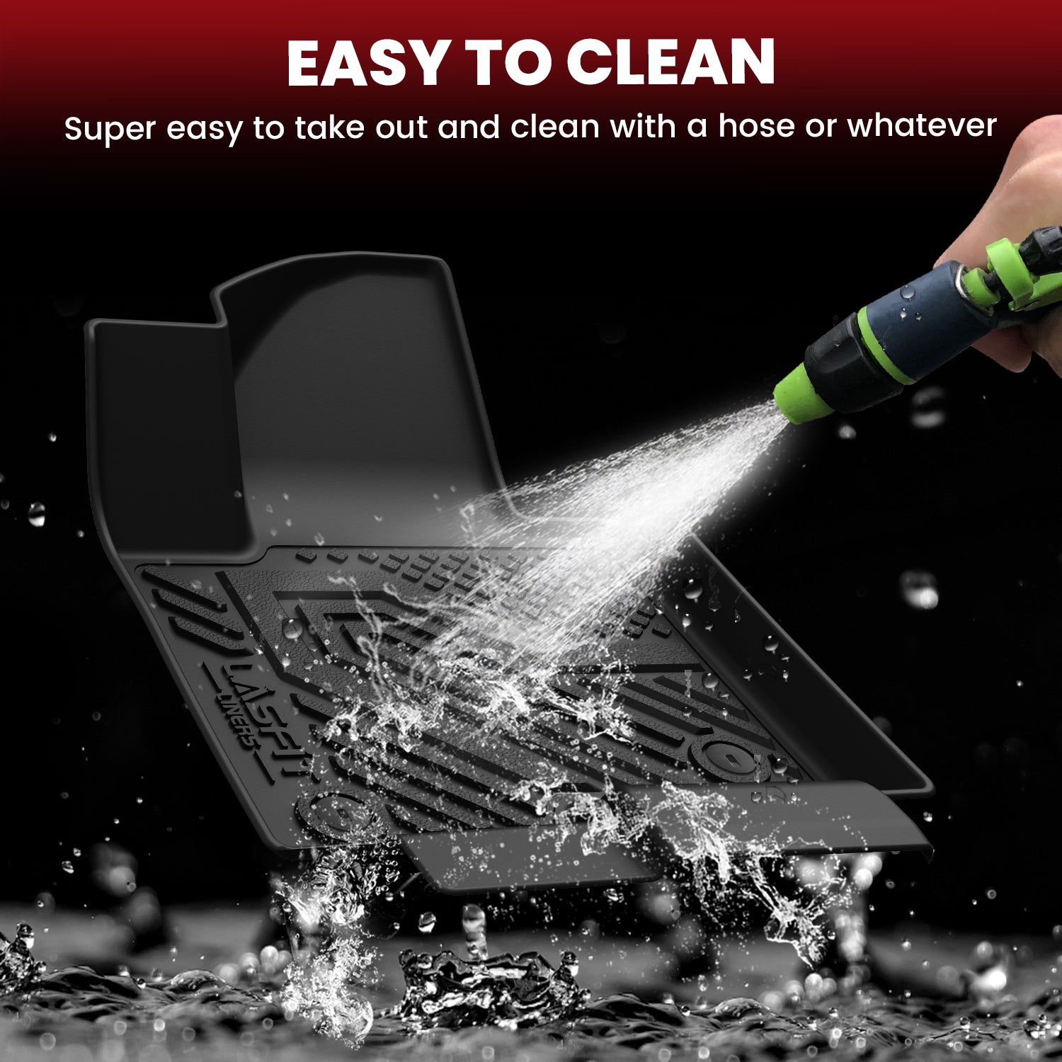 Lasfit floor liners are made from innovative low-density TPE material, offering several advantages over conventional rubber mats. These TPE mats are highly flexible, durable, and resistant to wear. Additionally, they are eco-friendly, manufactured from recyclable materials, and free of harmful chemicals, making them a safe and sustainable choice for your Kia Sorento. Cleaning is simple—just rinse with water and wipe dry, and they’re ready for your next drive.