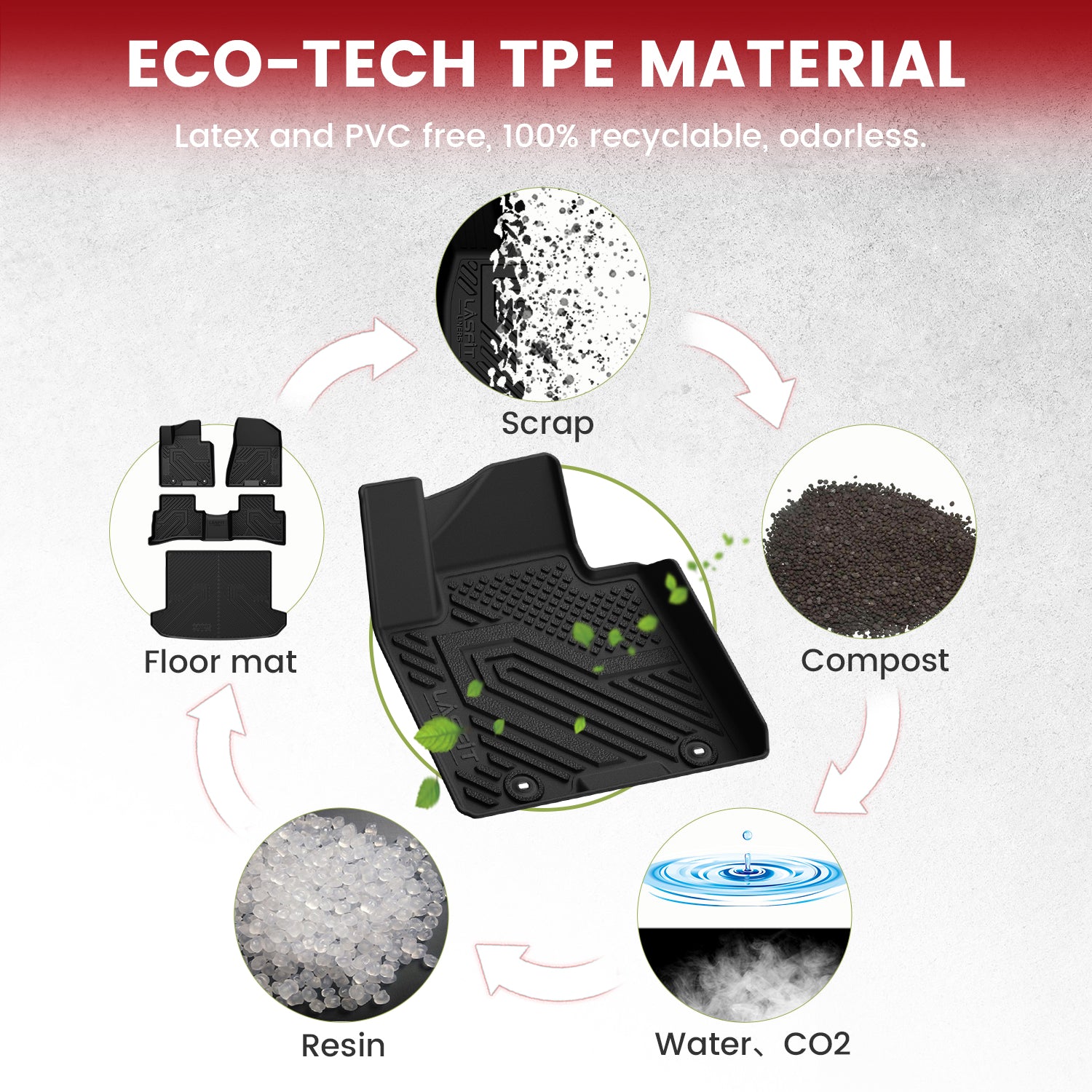 Upgrade your 2019-2021 Hyundai Tucson with our TPE floor mats. Unlike rubber ones, they're flexible, super durable, and resist wear well. Made from recyclable materials, they're eco-friendly and free of harmful chemicals. This makes them a safe, sustainable option for your vehicle.