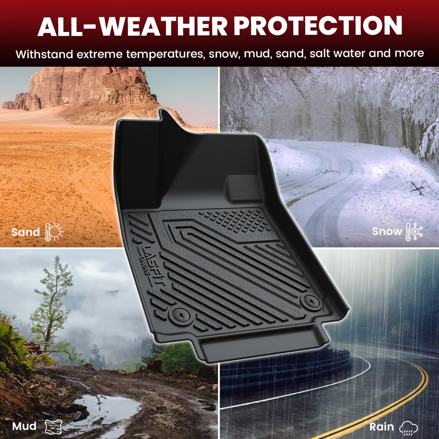 Our all-weather floor mats are designed to withstand any weather condition. They are stain-resistant, waterproof, and anti-slip, making them easy to clean and maintain. Built from high-quality materials, these liners won't break down under extreme weather or daily wear like rain, slush, snow, or mud. The durable edges resist slouching and won't deform in winter. After cleaning, the mats will look brand new, maintaining their effectiveness and appearance.