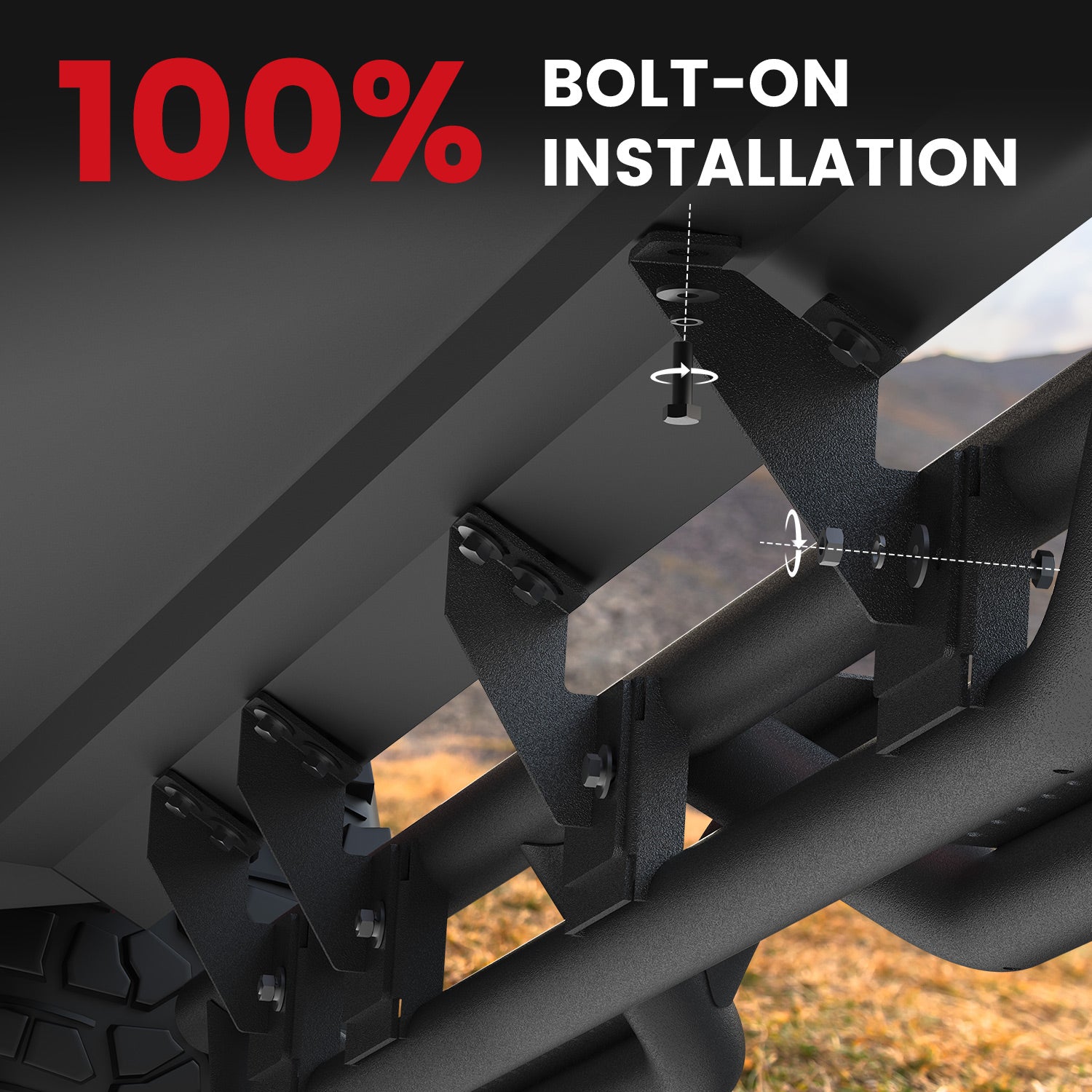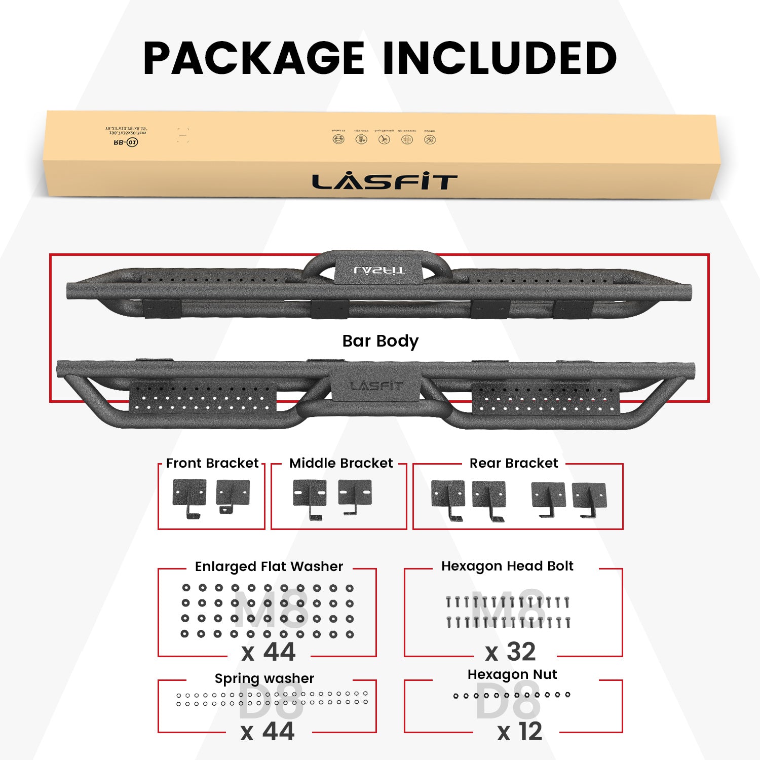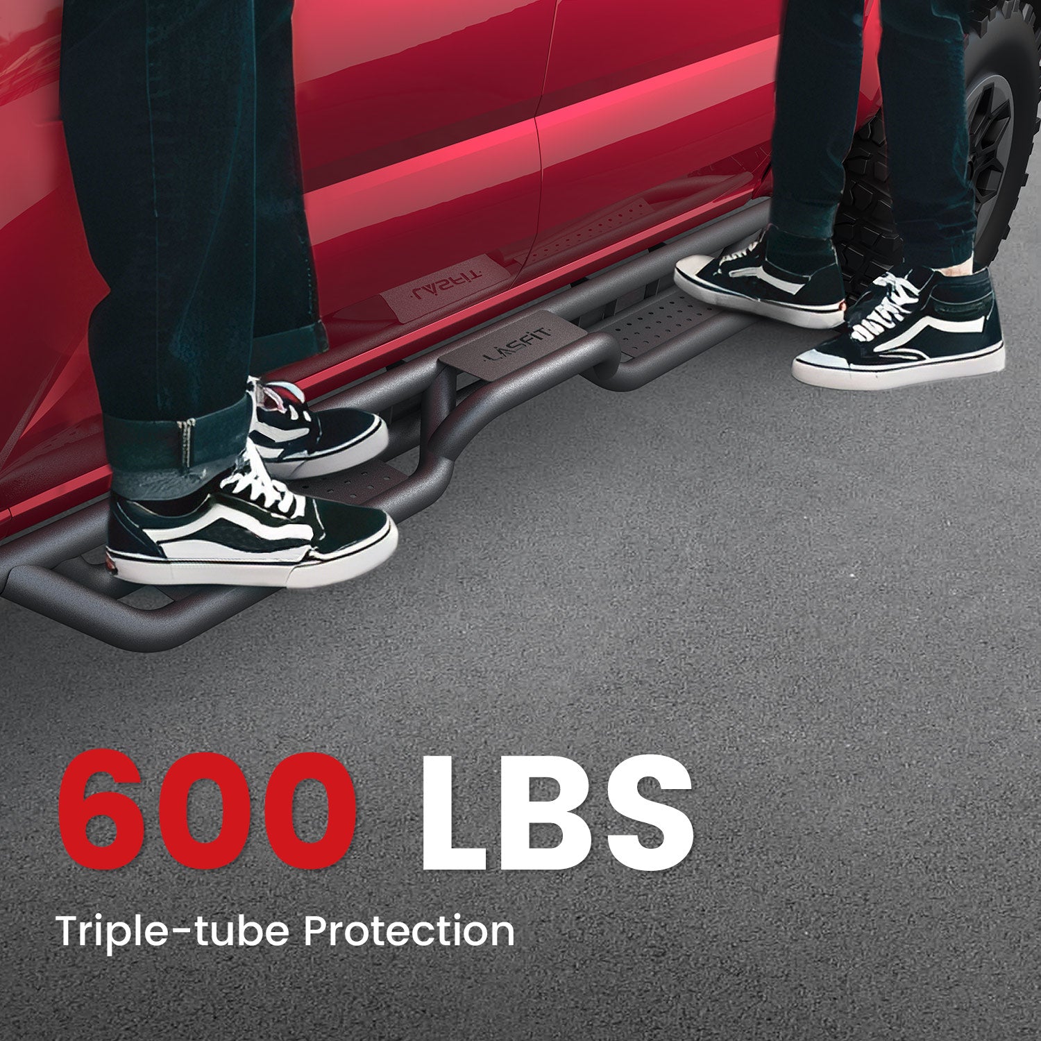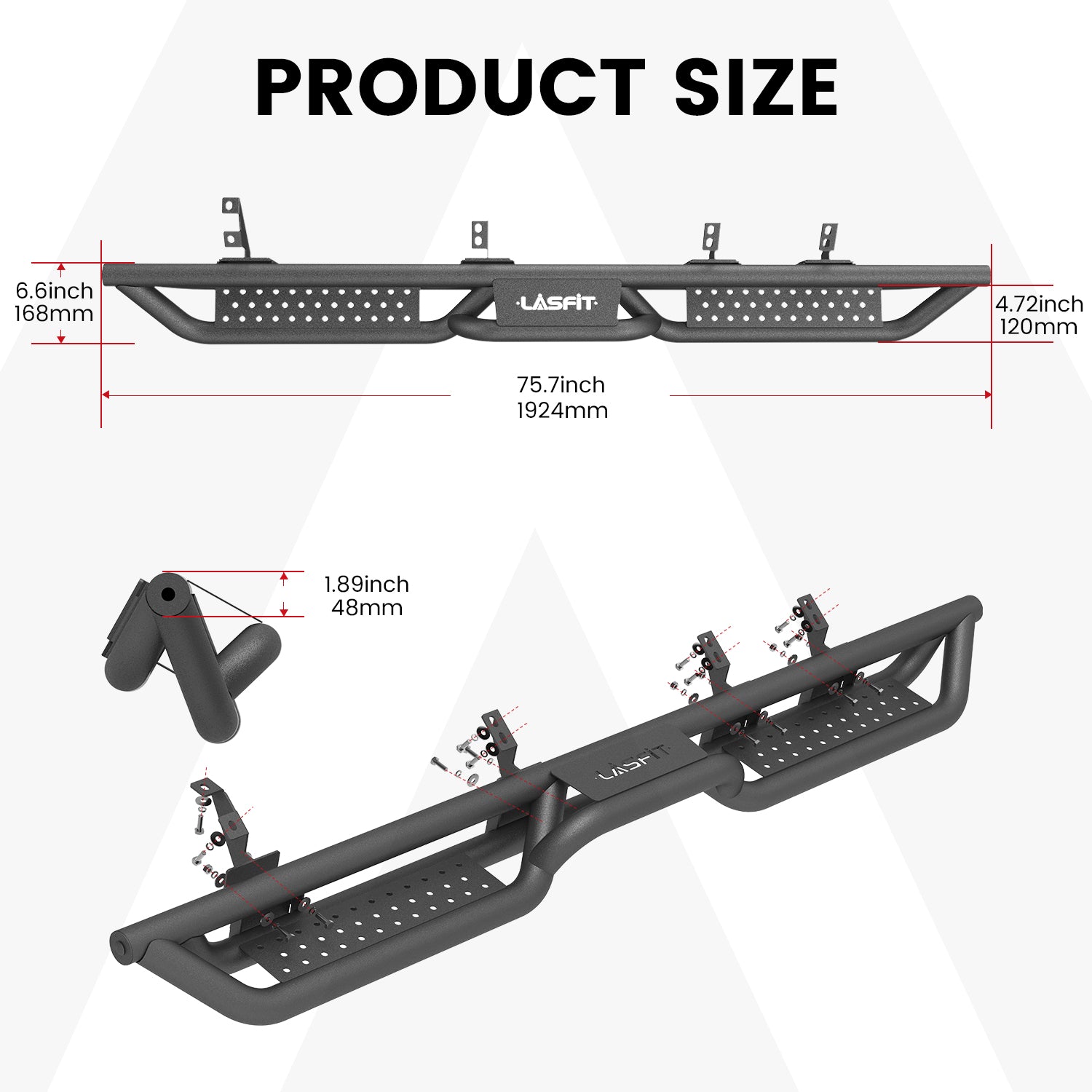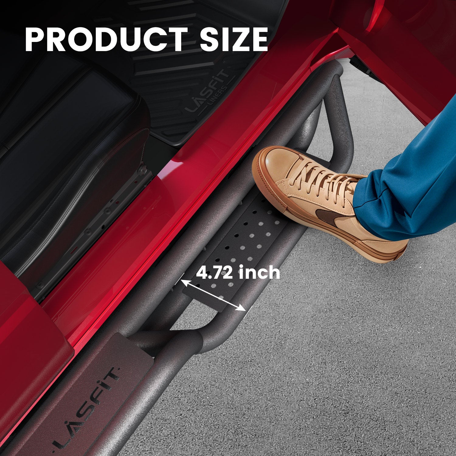 In addition to the high-strength medium carbon steel, Lasfit running boards are reinforced with three support tubes in a triangular design, ensuring maximum stability. A 0.55-inch steel bar connects the upper and lower support tubes, allowing the running boards to support up to 600 lbs. Perfect for daily use or off-road adventures, these running boards are designed to handle multiple passengers with ease.