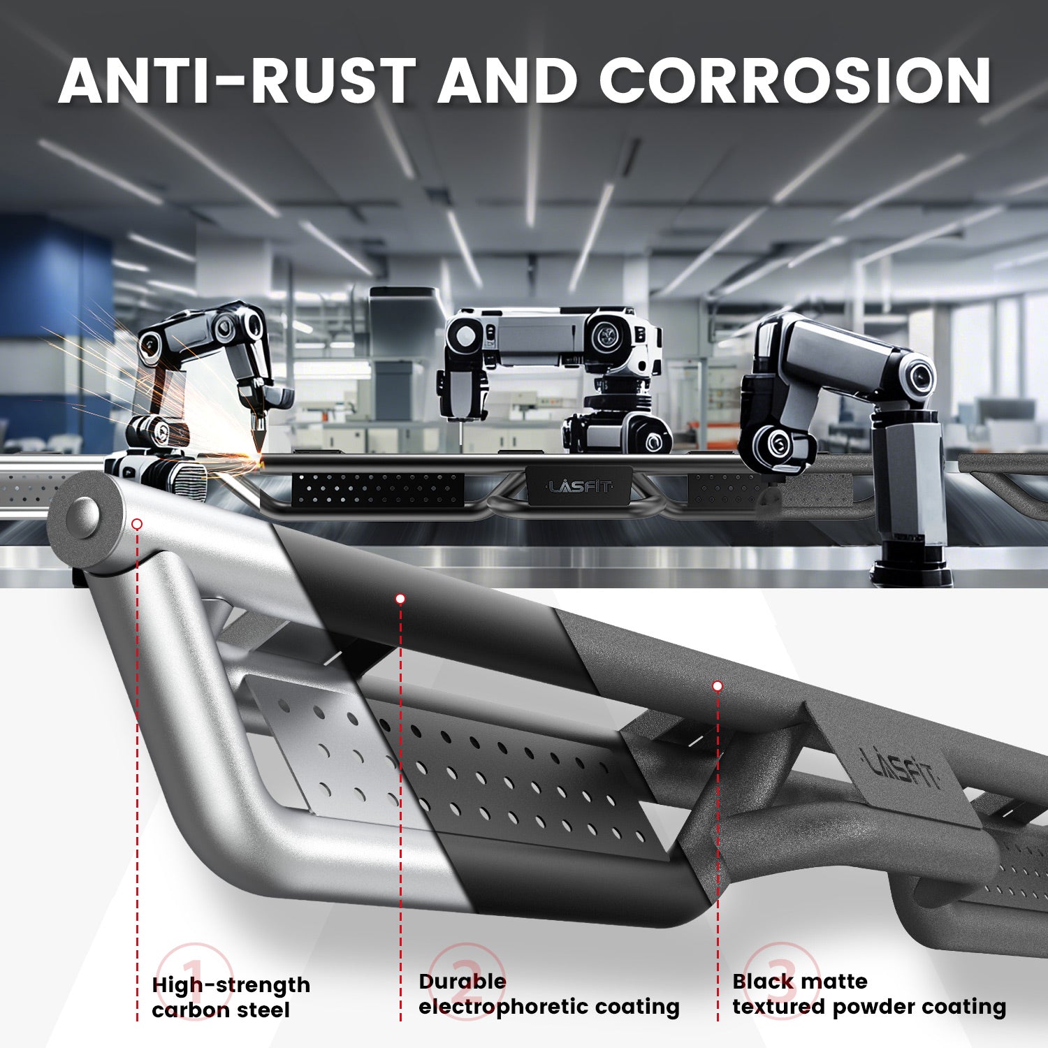 For ultimate protection, Lasfit running boards feature an electrophoretic coating that prevents rust and corrosion on the metal surface. This advanced coating provides a strong foundational layer, ensuring long-lasting durability for your Toyota Tacoma running boards.