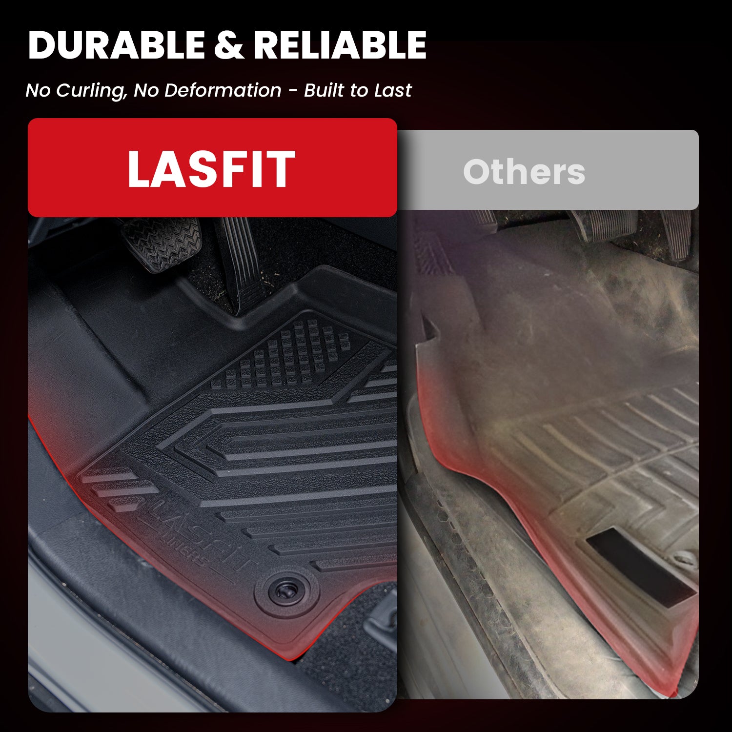 Lasfit floor mats are designed to offer enhanced coverage and durability compared to standard OEM options. They feature higher sidewalls, extended coverage under seats, and deeper surface textures to better contain dirt, water, and spills—making them especially suitable for families and daily use.