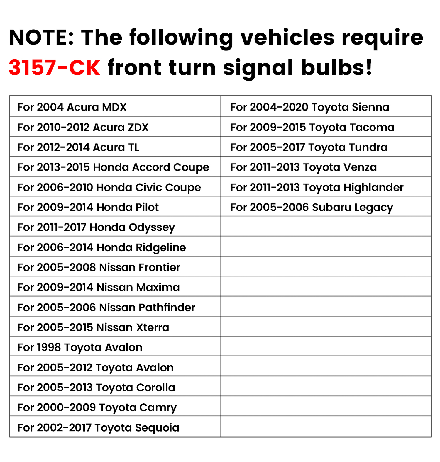 Besides, 3157 bulbs have CK and Non-CK circuit, some vehicles may require CK specific sockets. If you need the CK socket LED bulb, please click here. If you are not sure, please click here to find which bulb you need. If the bulbs can't work properly, please feel free to contact us to exchange the right bulbs.