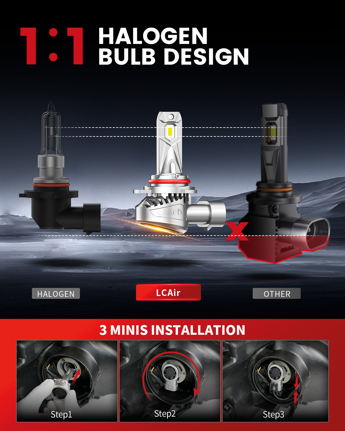 Looking for LED bulbs to upgrade your OEM halogen headlights? The narrow headlight housing may be causing an issue with the fit of standard round-bottom LED bulbs. We have great news! Lasfit has developed the LCair series, a new LED bulb with a compact design that is a perfect fit for your vehicle. Each bulb in the LCair series has a power output of 35W and produces 3500LM, making them 400% brighter than stock halogen bulbs. What's even better is that the cooling system of these LED bulbs has been upgraded to ensure stable performance, even in sealed headlight housings with dust covers. It's the latest and greatest LED upgrade solution for your vehicle.