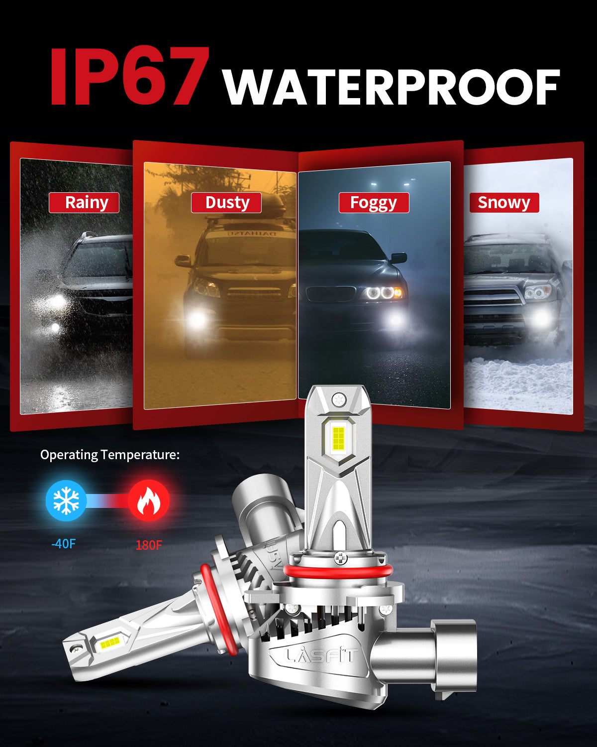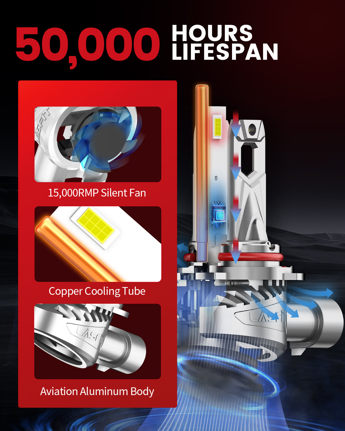 The compact and powerful Lasfit LCair series LED bulbs, with 15000RMP silent fan and specially designed flip chips integrated on a copper board, these bulbs ensure efficient heat conduction and dissipation. This allows them to work stably even in sealed headlight housings with dust covers. Experience high brightness and reliable lighting performance with the Lasfit LCair series 9012 LED Bulbs.