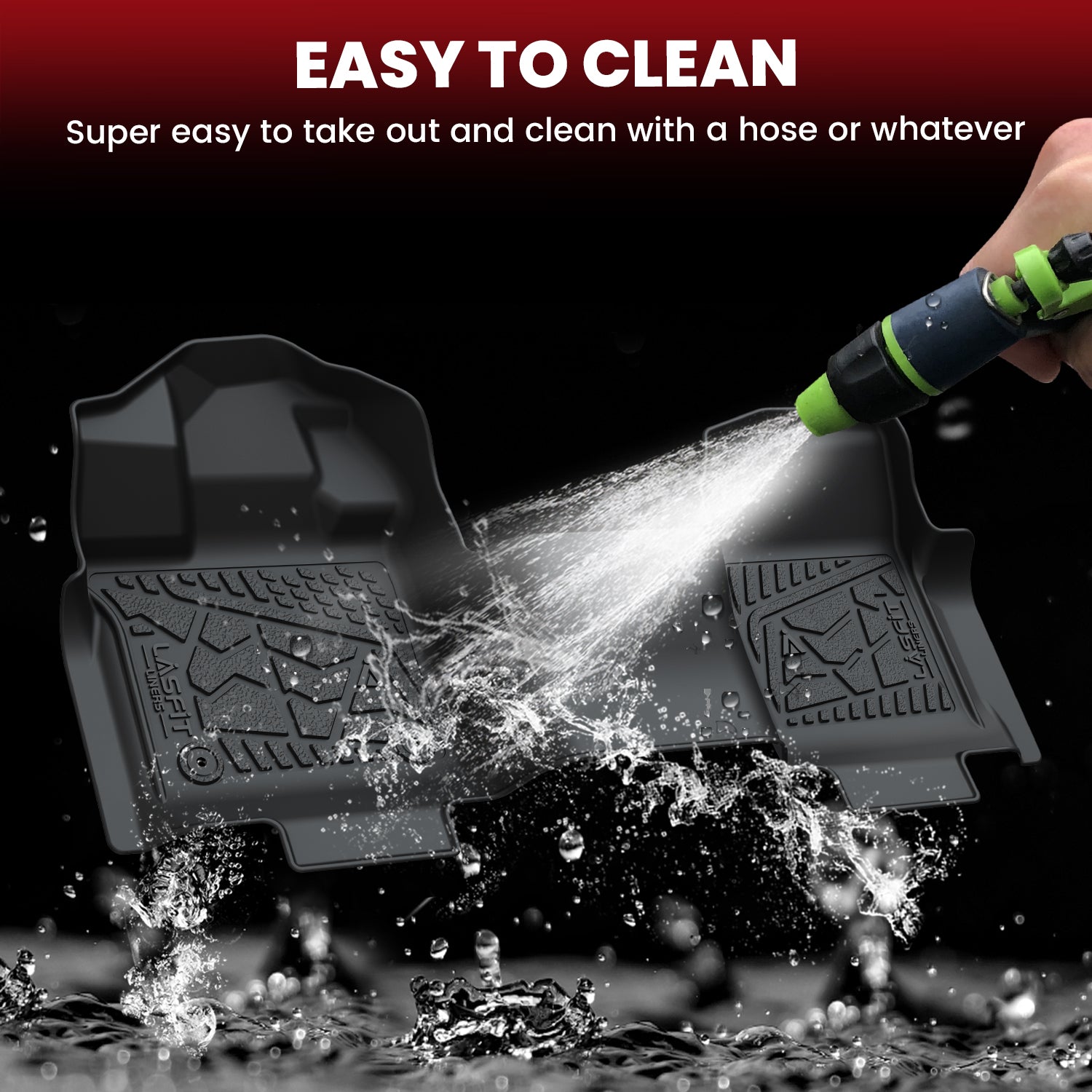 Lasfit's custom-fit floor liners are engineered with advanced 3D scanning technology to perfectly match the contours of your Ford F150’s interior, covering every inch of your vehicle's floor. The anti-slip design keeps the mats securely in place for a safer driving experience, while raised edges and innovative channels effectively trap spills, debris, and dirt, making cleanup effortless.