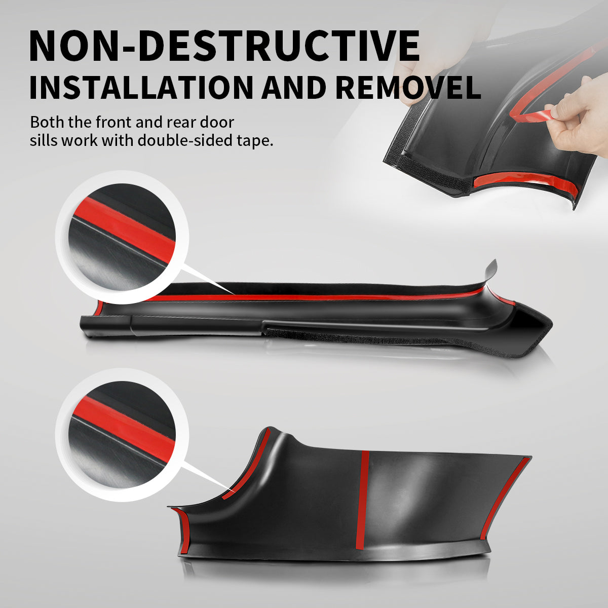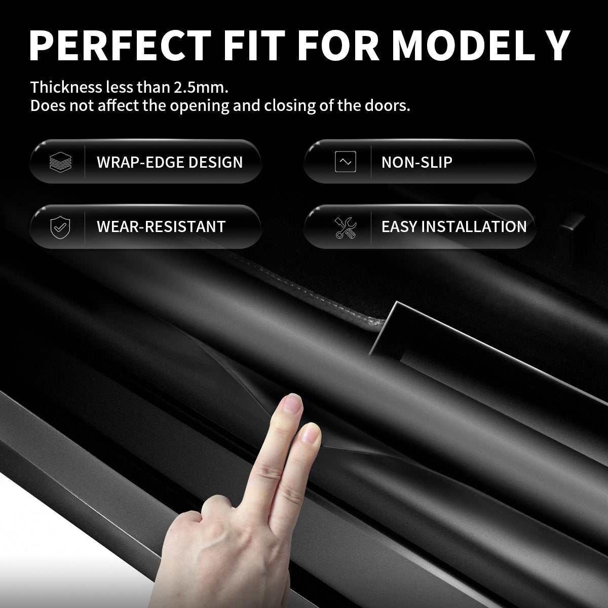 LASFIT door sill protectors are custom-fit for the front & rear doors for your Tesla, ensuring a perfect fit and seamless integration with the overall aesthetic of your Model Y. The thickness less than 2.5mm, does not affect the opening and closing of the doors.