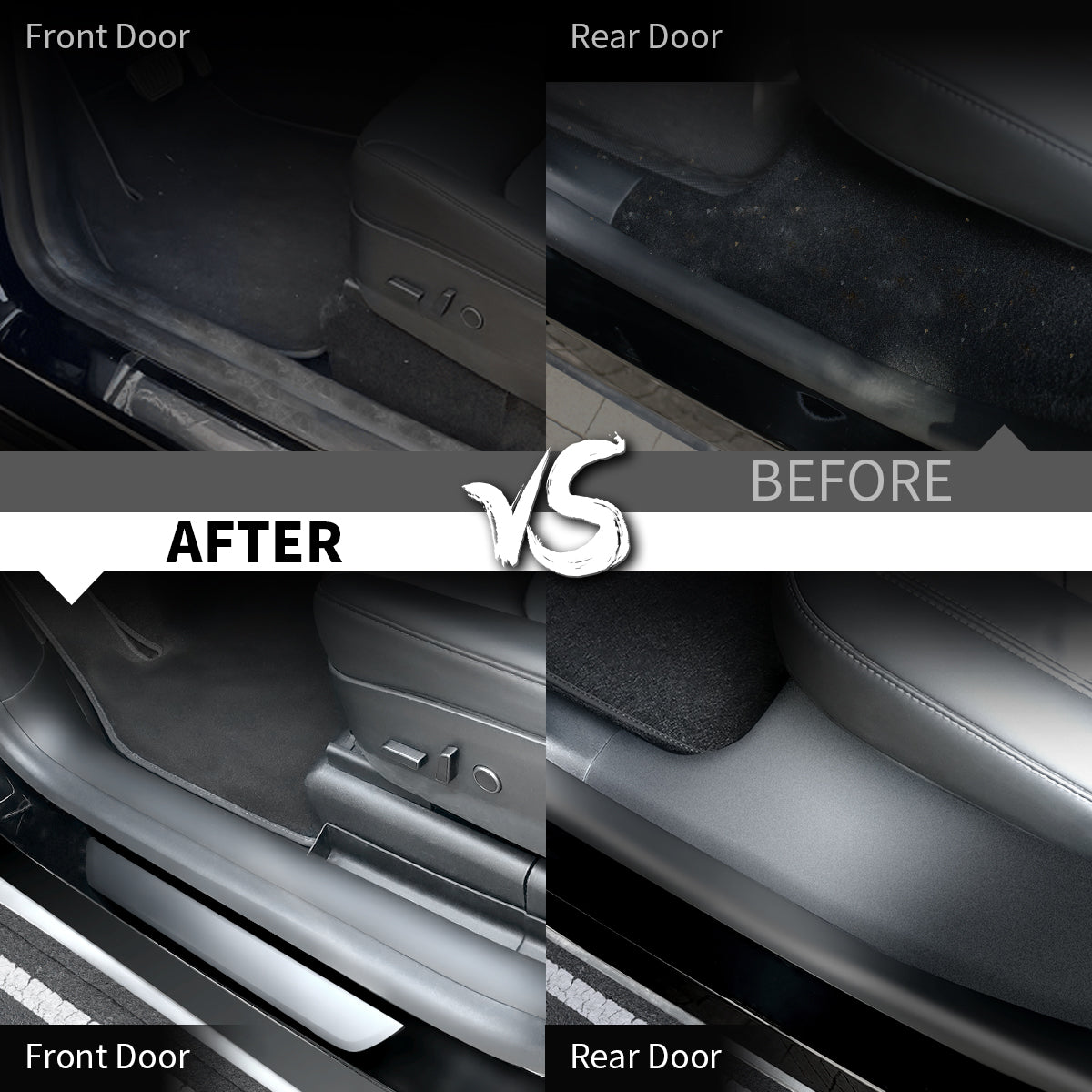 The smooth surface makes it easy to clean by using a damp cloth to wipe off the dirt. Regular cleaning helps maintain and greatly prolong the lifespan of your vehicle’s interior. With them, you won't need to worry about your original door sills getting scuffed and stained.