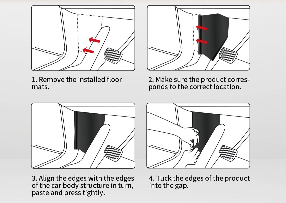 Clean the door sill with a damp towel, align the edge of the door sill protector to the correct position on your Model Y, peel off the backing of the double-sided tape, stick the door sill protector to the door sill, and pry the door's soft rubber cover over the product.