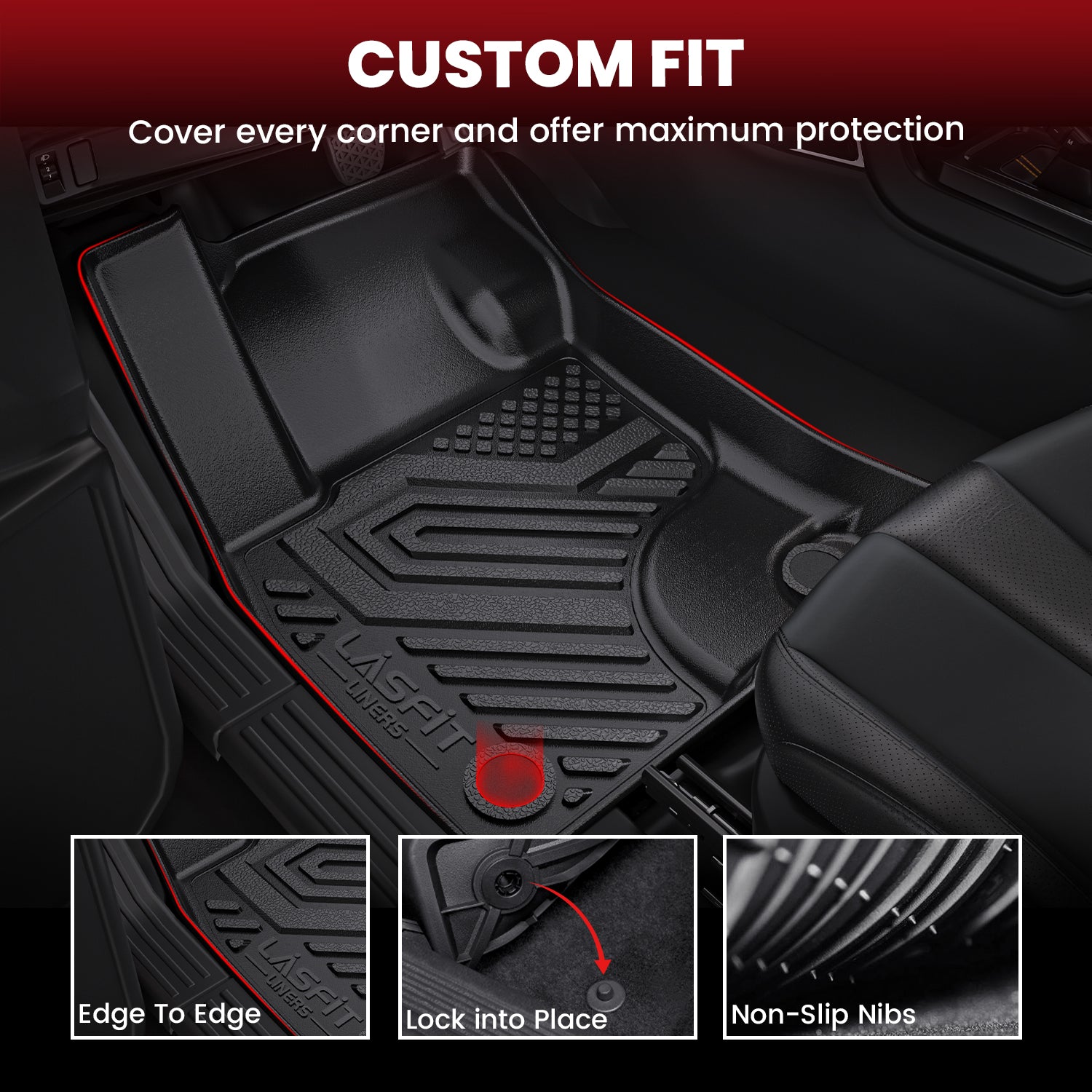 Lasfit's custom-fit floor liners are engineered with advanced 3D scanning technology to perfectly match the contours of your Ford Escape’s interior, covering every inch of your vehicle's floor. The anti-slip design keeps the mats securely in place for a safer driving experience, while raised edges and innovative channels effectively trap spills, debris, and dirt, making cleanup effortless.