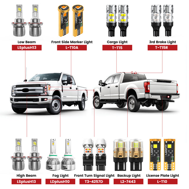 Lasfit offers a full LED bulb upgrade solution for the 2017-2019 Ford F250 & F350! Here, you’ll find Lasfit’s brightest LED headlight bulbs, along with LED fog lights, turn signal lights, and other exterior LED options.