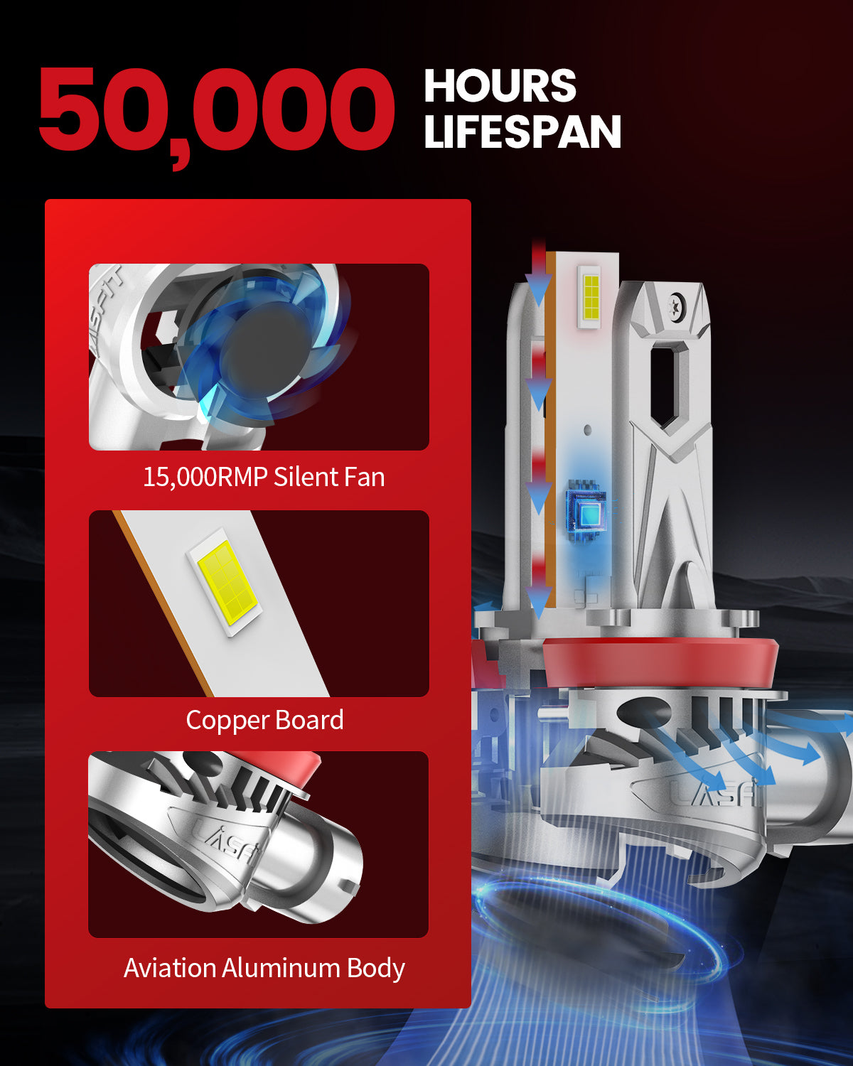 The compact and powerful Lasfit LCair series LED bulbs, with a built-in 26MM hydraulic cooling fan and specially designed flip chips integrated on a copper board, these bulbs ensure efficient heat conduction and dissipation. This allows them to work stably even in sealed headlight housings with dust covers. Experience high brightness and reliable lighting performance with the Lasfit LCair series H11 LED Bulbs.