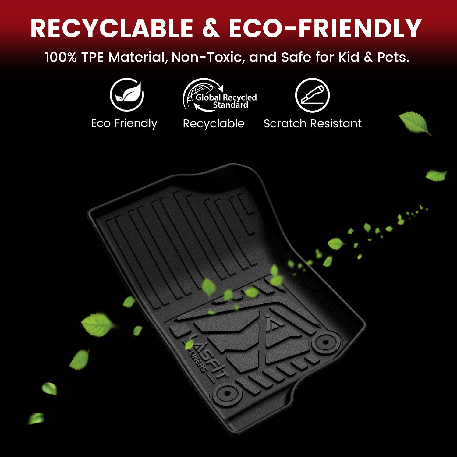 Made from 100% brand-new Thermoplastic Elastomer (TPE) imported from Sweden, Lasfit floor mats for Wrangler are fully recyclable and environmentally friendly. They are free of allergens, BPA, latex, harmful PVCs, lead, phthalates, dioxins, cadmium, and other toxic substances.