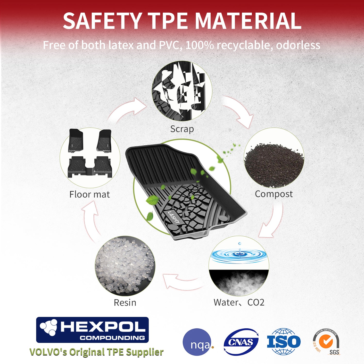 Crafted from 100% brand-new Thermoplastic Elastomer (TPE) imported from Sweden, Lasfit floor mats for Wrangler are fully recyclable and environmentally friendly. They are free from allergens, BPA, latex, harmful PVCs, lead, phthalates, dioxins, cadmium, and other toxic substances.