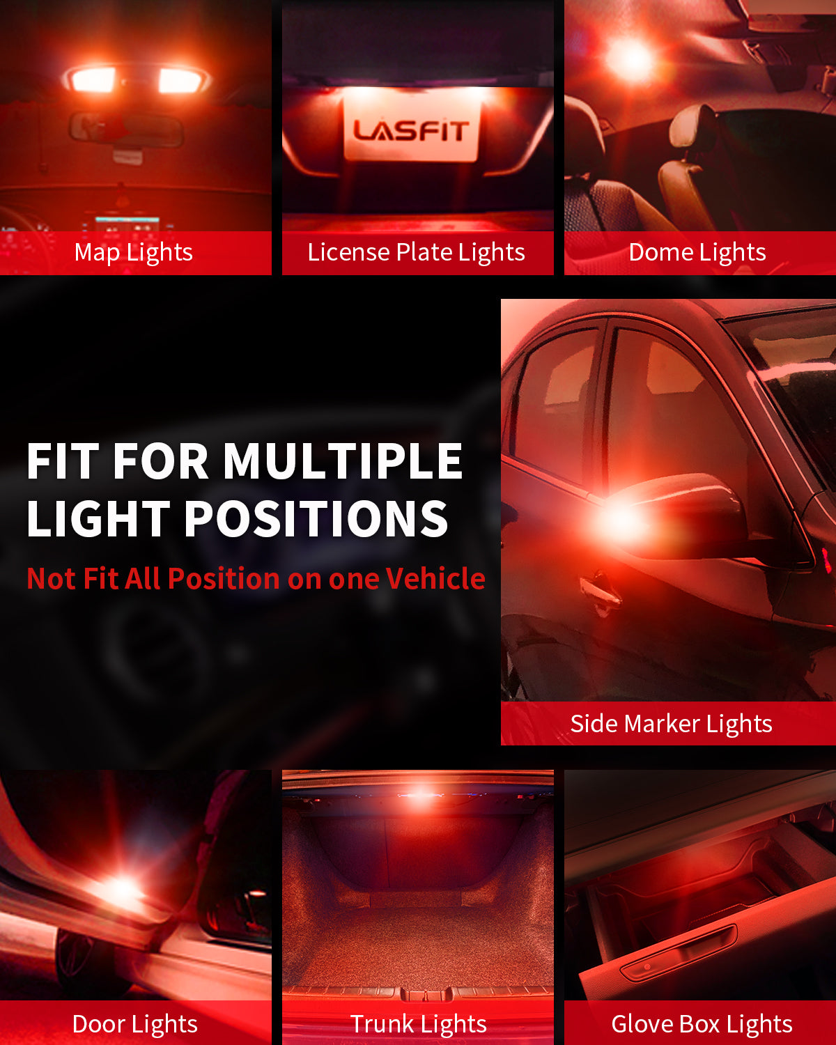 LASFIT offers you the different choices of the high-performance bright white light or cool blue, ice blue, amber yellow, green, purple, etc for a more stylish auto interior light bulbs. Extremely bright light will help you get extraordinary driving experience.