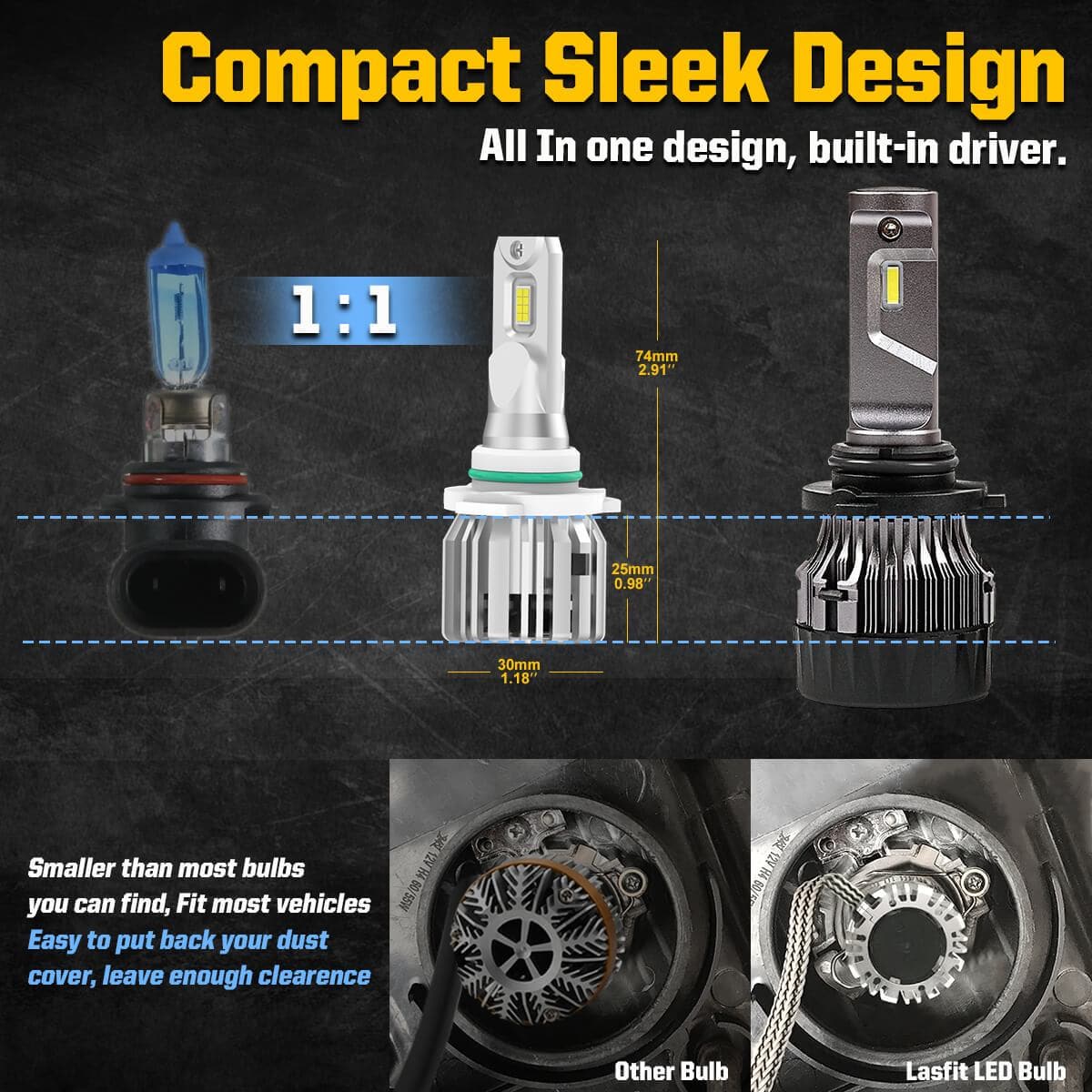 The smallest size of all Lasfit 6 different series LED bulbs to fit over 95% vehicles without modifying the OEM dust cap. The bulbs are also designed as small as it can to fit the assembly with bulb hole off the center. LC plus is one of the smallest LED lights on the market, with built-in driver which can perfectly fit most vehicles without installation issues.