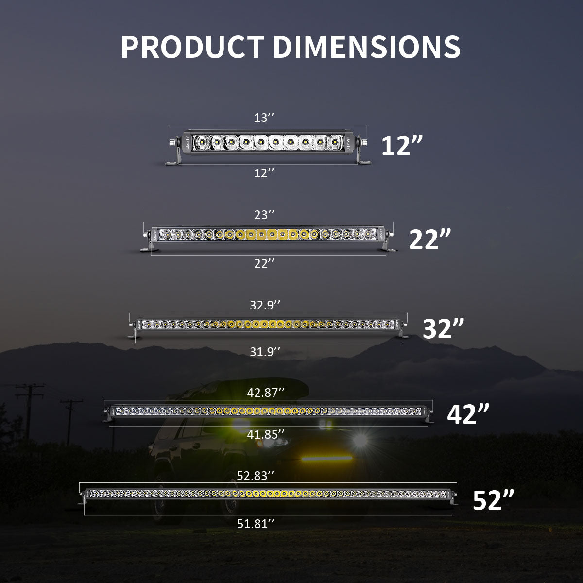 - 12"- 52" LED light bars are well suited for Jeep, Ford, Toyota, GMC, Chevrolet, Ram, Subaru, Nissan, Lexus, Rivian, and a variety of other vehicles.