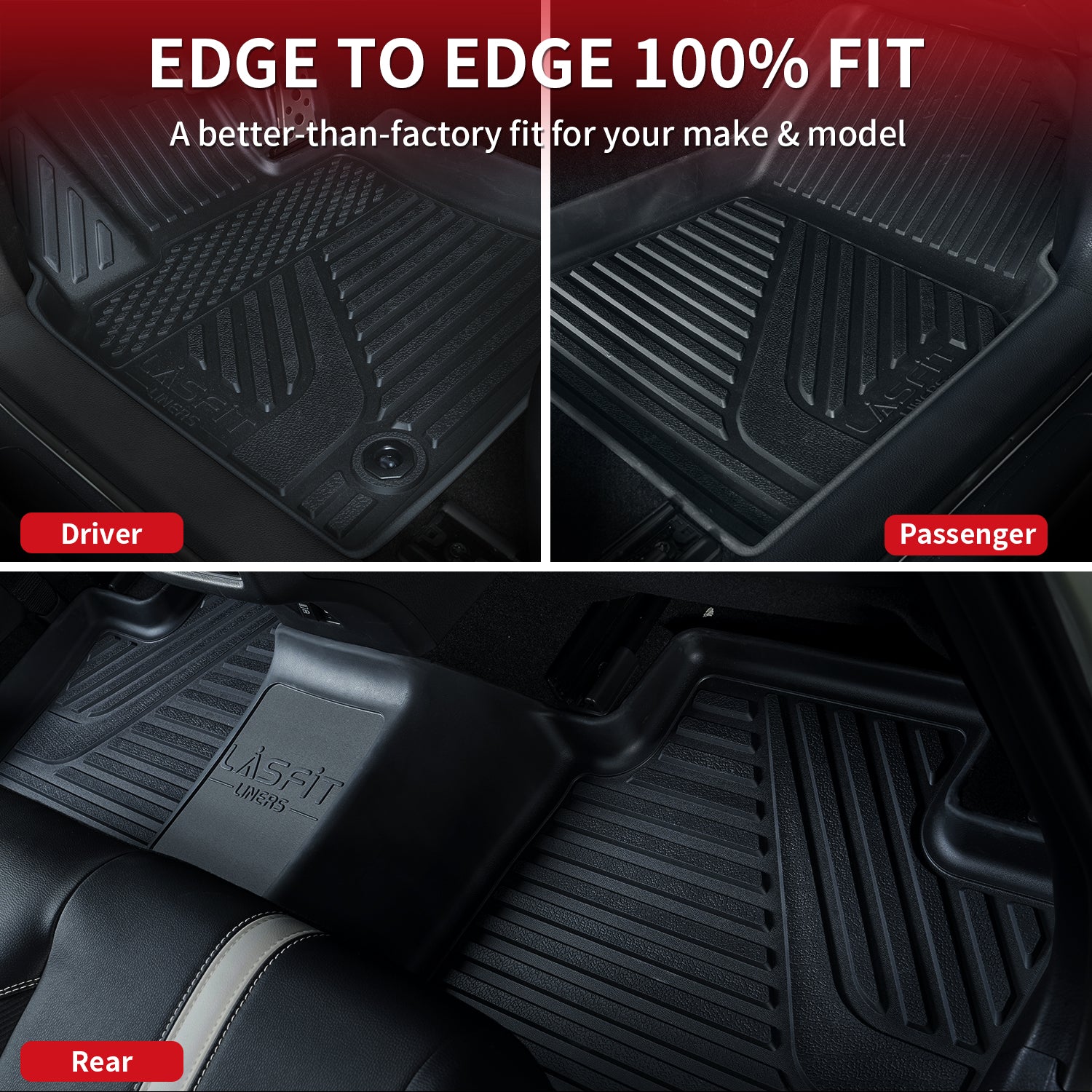 Our all-weather floor liners are crafted to endure any weather condition. They are stain-resistant, waterproof, and anti-slip, making maintenance simple. Constructed from high-quality materials, these liners resist wear from rain, slush, snow, and mud. Unlike standard OEM floor mats, Lasfit liners have reinforced edges that prevent curling and maintain their shape through harsh winters. After a quick clean, they look brand new, maintaining both functionality and appearance.