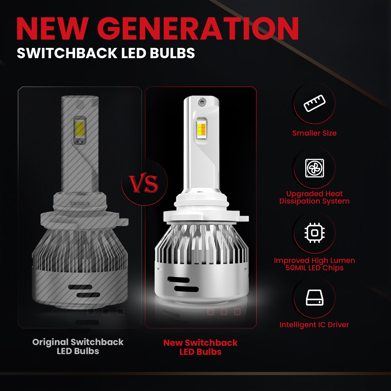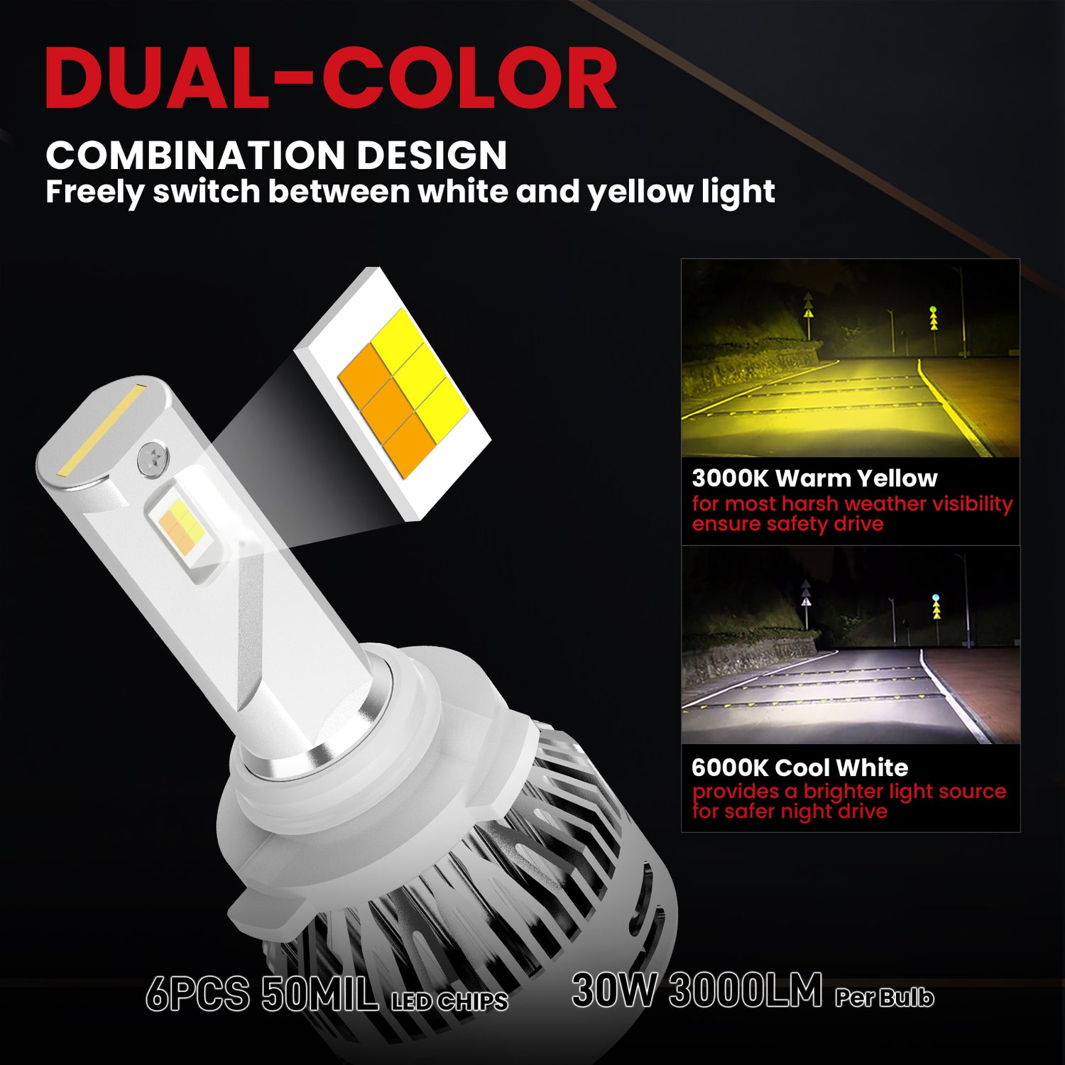Lasfit LDplus series led 9005/HB3 switchback bulb with a brand new appearance provides a unique way to upgrade your vehicle's lighting. 2 Modes Switchback-3000K yellow/6000K white light increasing overall visibility and road illumination in rainy, snowy, harsh weather.