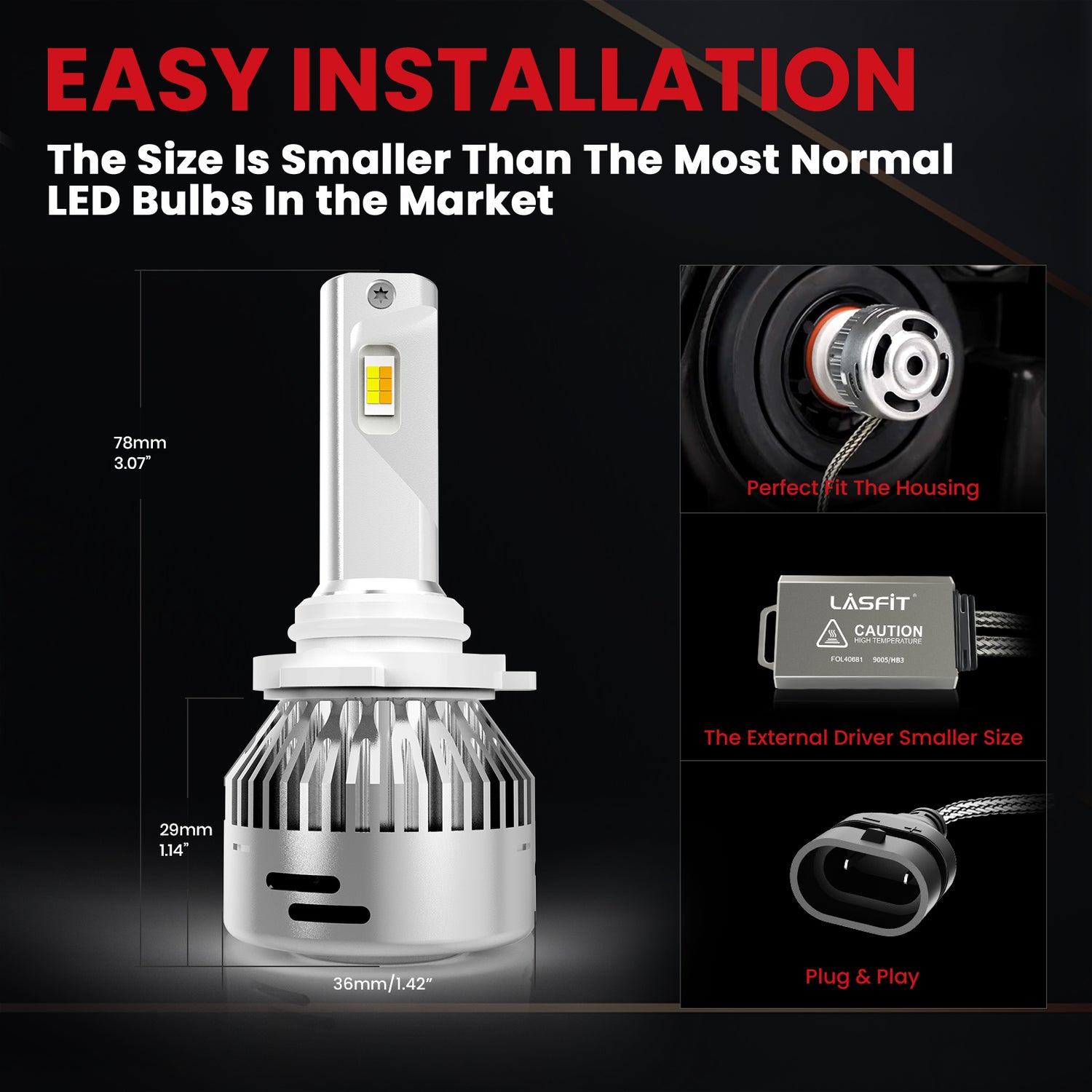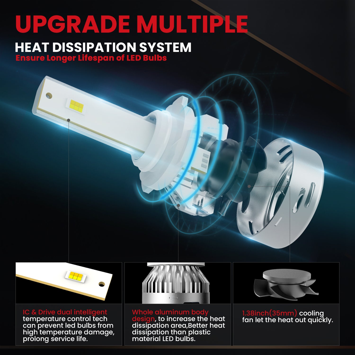 Use a 35mm cooling fan with 5-blade. The all-in-one compact aluminum design brings better heat dissipation than common plastic design, and intelligent IC make sure the LED conversion kits last longer.