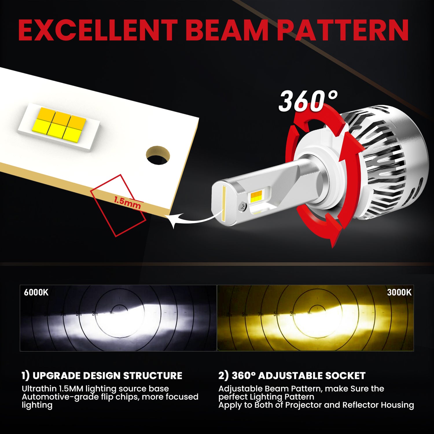 The 1.5mm aluminum parts are much thinner than the common ones in the market which could perform with no dark spot. The LED chips from each size are closer to the factory halogen bulbs to carry a brighter and more concentrated light output than stock lights. They also provide excellent night time driving by taking an amplified flux beam with 6 pieces 55 MIL chips on each side.