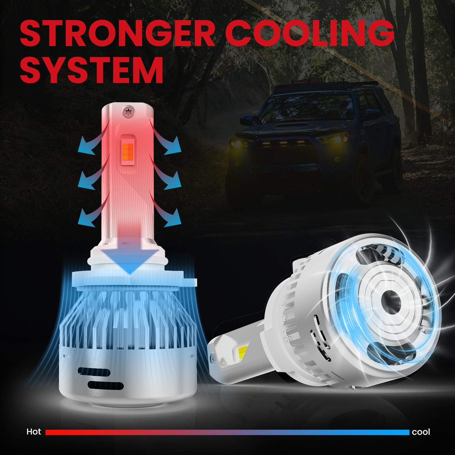 The bulbs use a new cooling system with a unique double ball-bearing fan preventing the driving from the loud noise from the cooling fan.